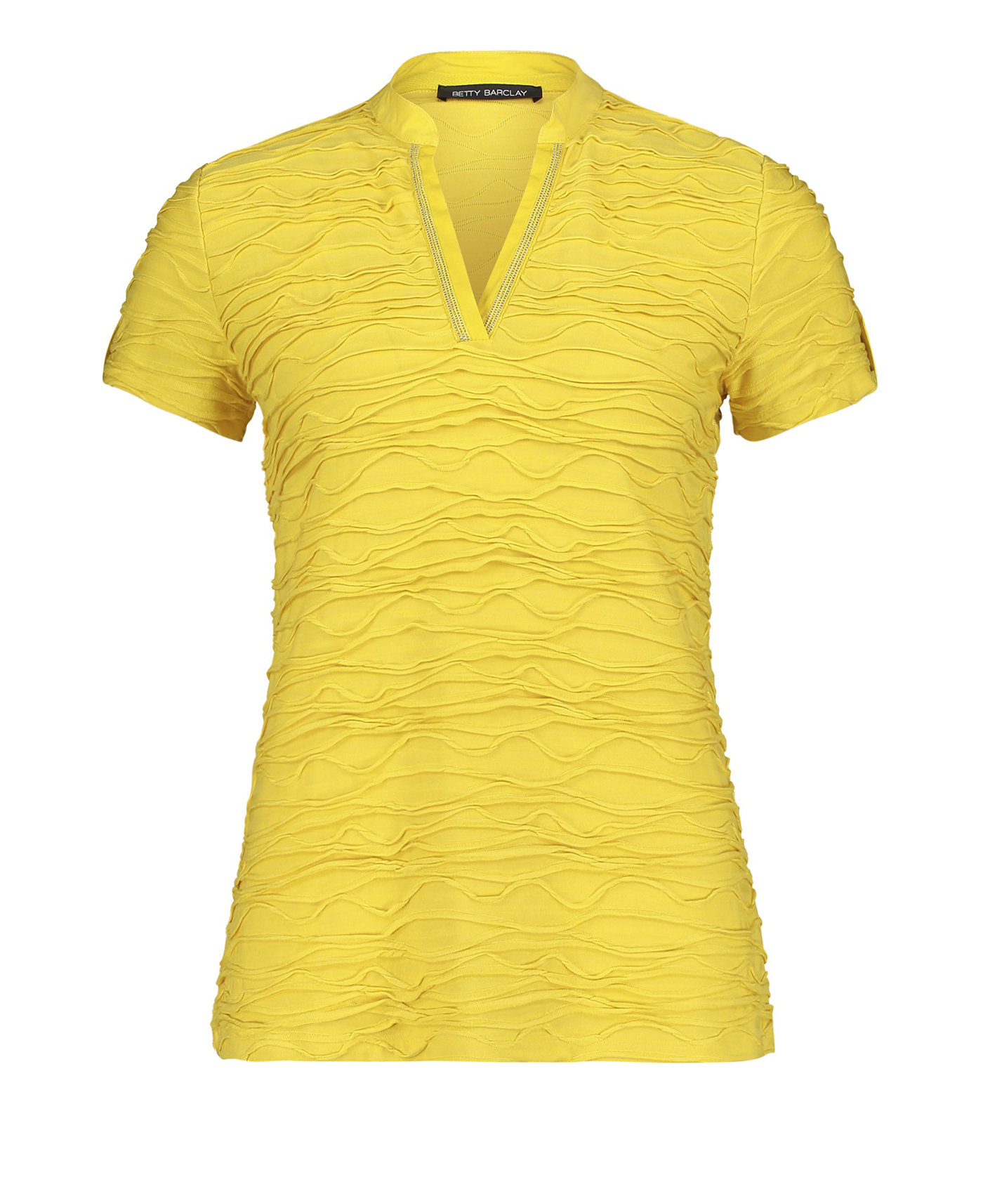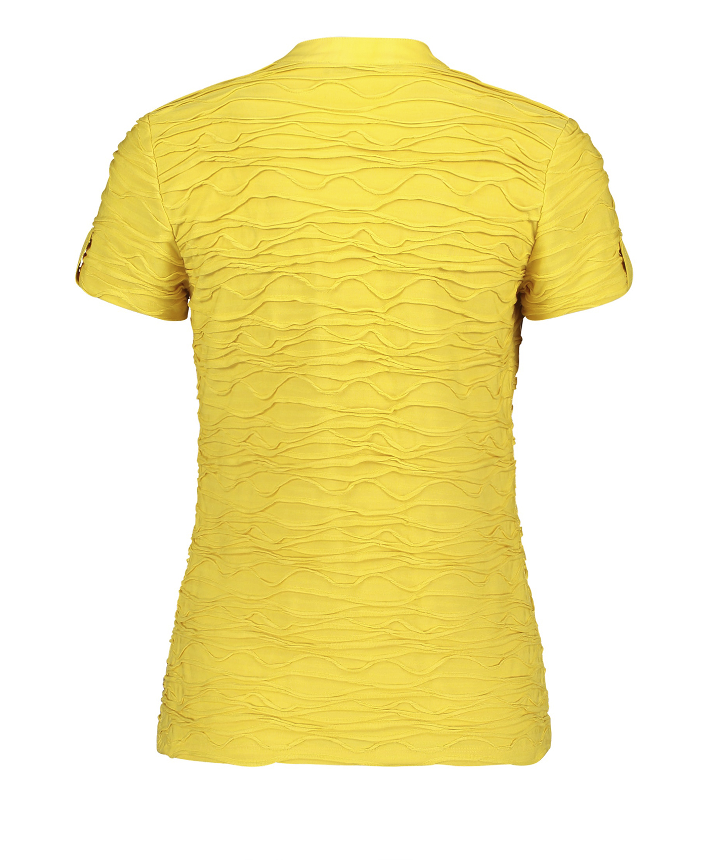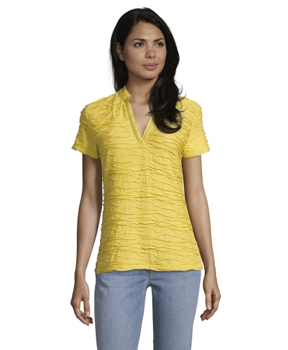 Однотонная футболка прямого покроя - абсолютно необходимая вещь в гардеробе. Короткие рукава, V-образный вырез горловины с отделкой тесьмой. Интересная фактура ткани привлекает внимание. Футболка отлично сочетается как с брюками, так и с юбкой.