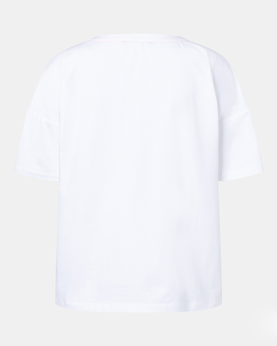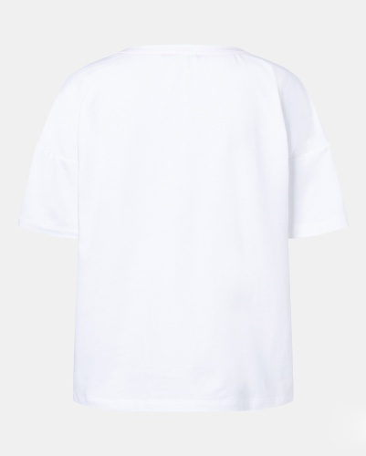 Яркий принт этой футболки непременно привлечет внимание! Футболка свободного силуэта. Круглый вырез горловины, короткие рукава со спущенным плечом. Приятный к телу материал из хлопковой смеси.