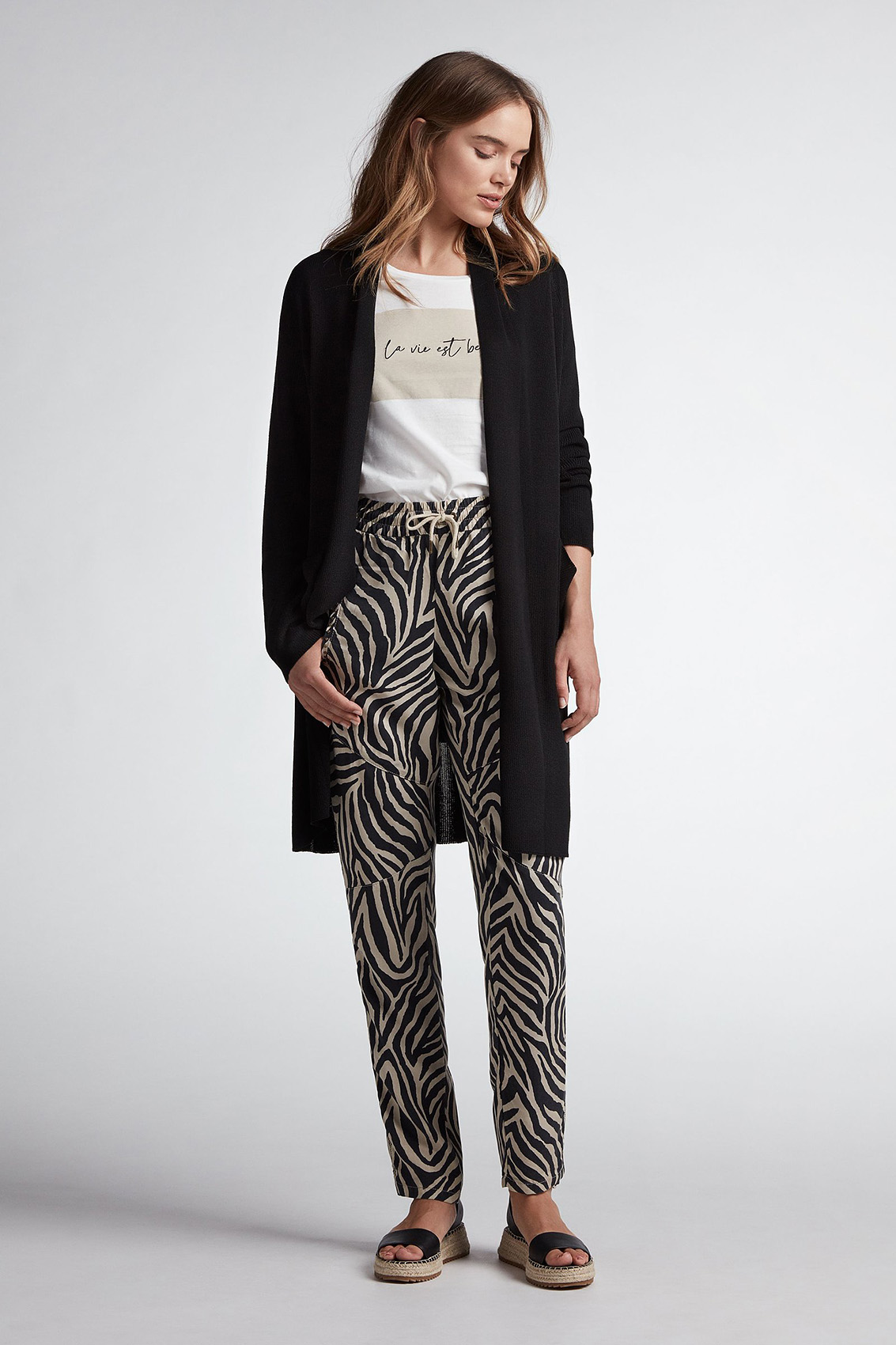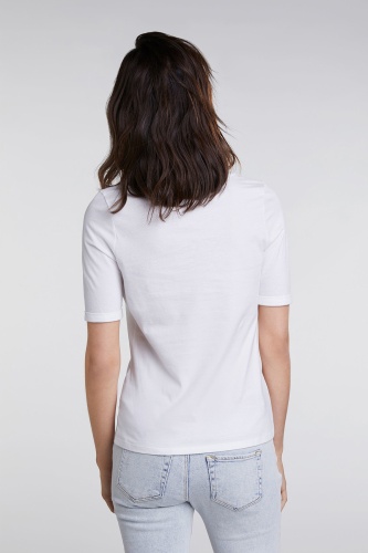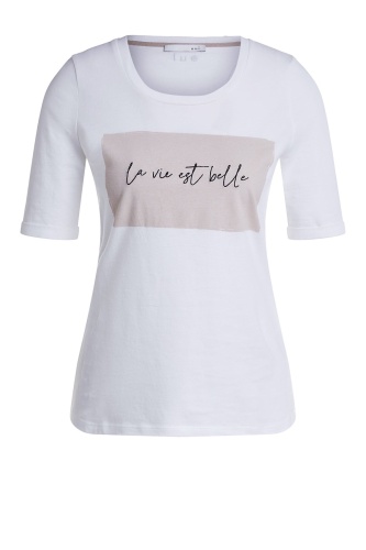 Эта футболка лаконична и элегантна в своем дизайне. Приталенный крой подчеркивает достоинства фигуры. Круглый вырез горловины, короткие рукава с фиксированными манжетами. Стильный акцент - принт с вдохновляющей надписью. Хлопковый материал приятен к телу и обеспечивает комфорт. Эта модель - прекрасный компаньон для образа как с брюками, так и с юбкой.