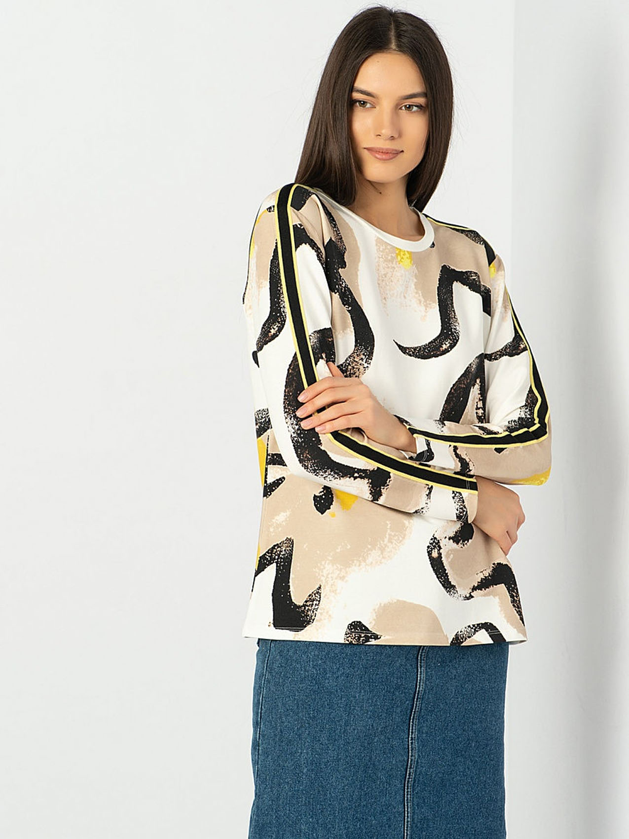 Футболка-лонгслив. Трендовый абстрактный принт. Слегка приталенный силуэт. Декоративная лента на плечах и рукавах. Материал из смеси хлопка, модала и эластана обеспечивает комфорт. Длина изделия по спинке: 65 см.