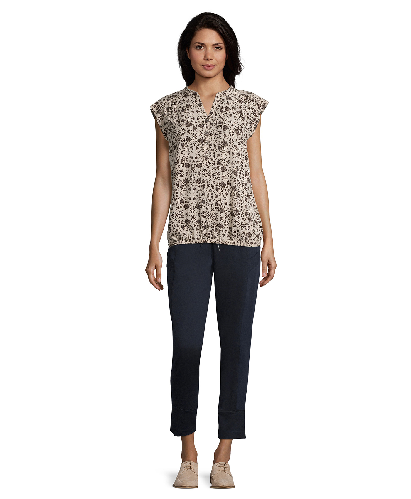 Цветочный принт в тренде! Топ свободного покроя с короткими рукавами и V-образным вырезом горловины. Вискозный материал приятен к телу и обеспечивает максимальный комфорт. Эта современная модель - идеальный компаньон для любого однотонного варианта низа.