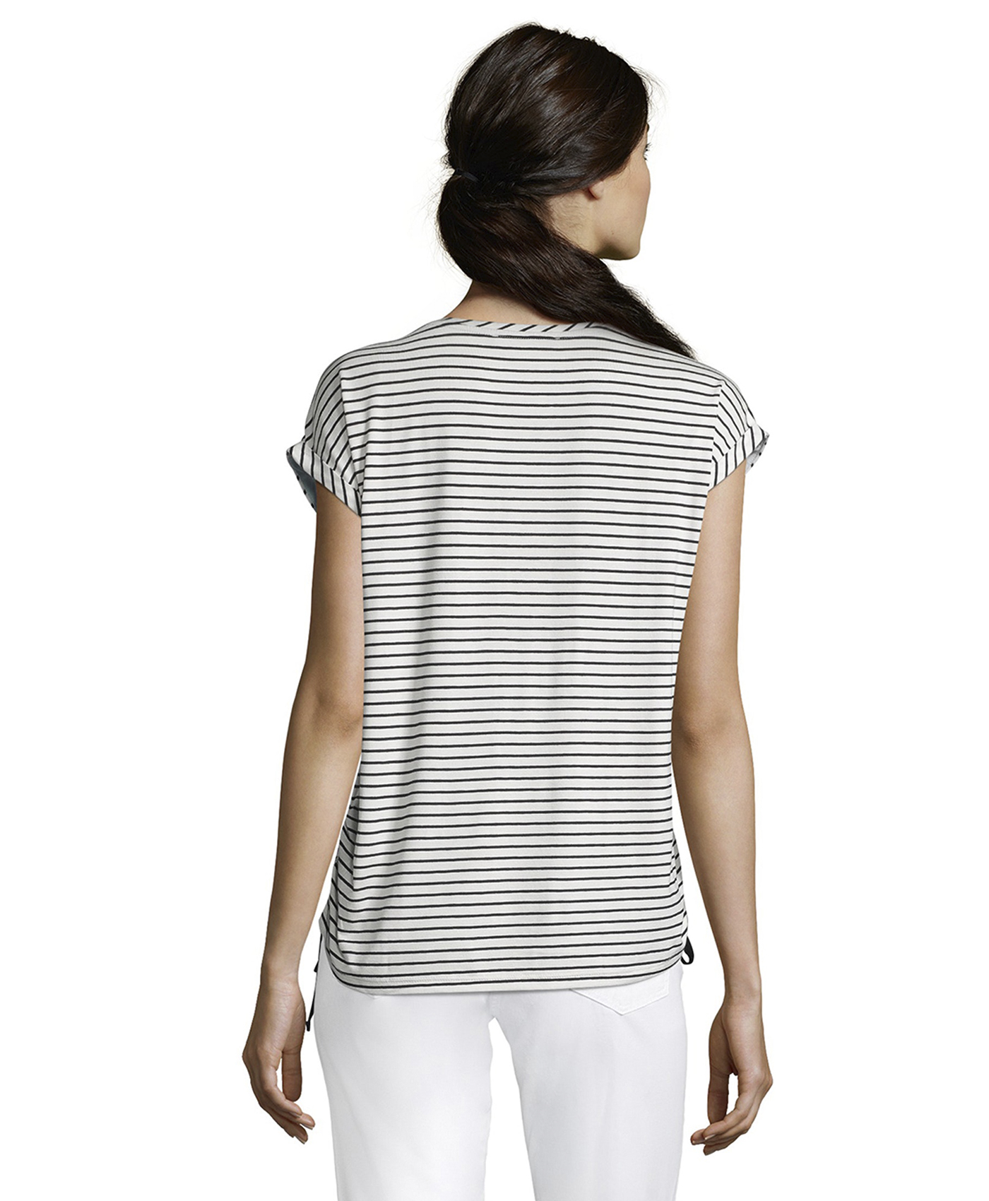 Топ прямого покроя. Круглый вырез горловины с обтачкой, короткие цельнокроеные рукава с фиксированными манжетами. Сочетание принтов и фактур непременно обратит на себя внимание. Абстрактный принт на переде изделия, принт в полоску - на спинке. Кулиски по бокам, декоративный карман на груди. Материал из вискозной смеси приятен к телу и обеспечивает комфорт. Эта женственная модель прекрасно смотрится с любым лаконичным вариантом низа.