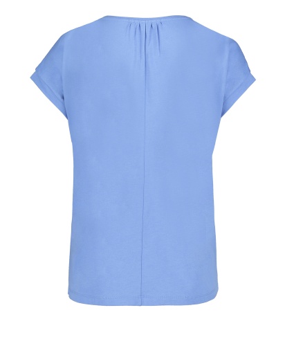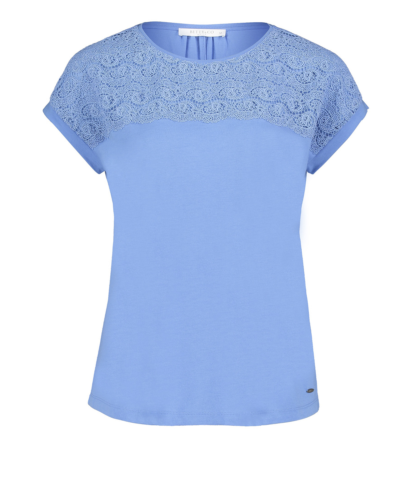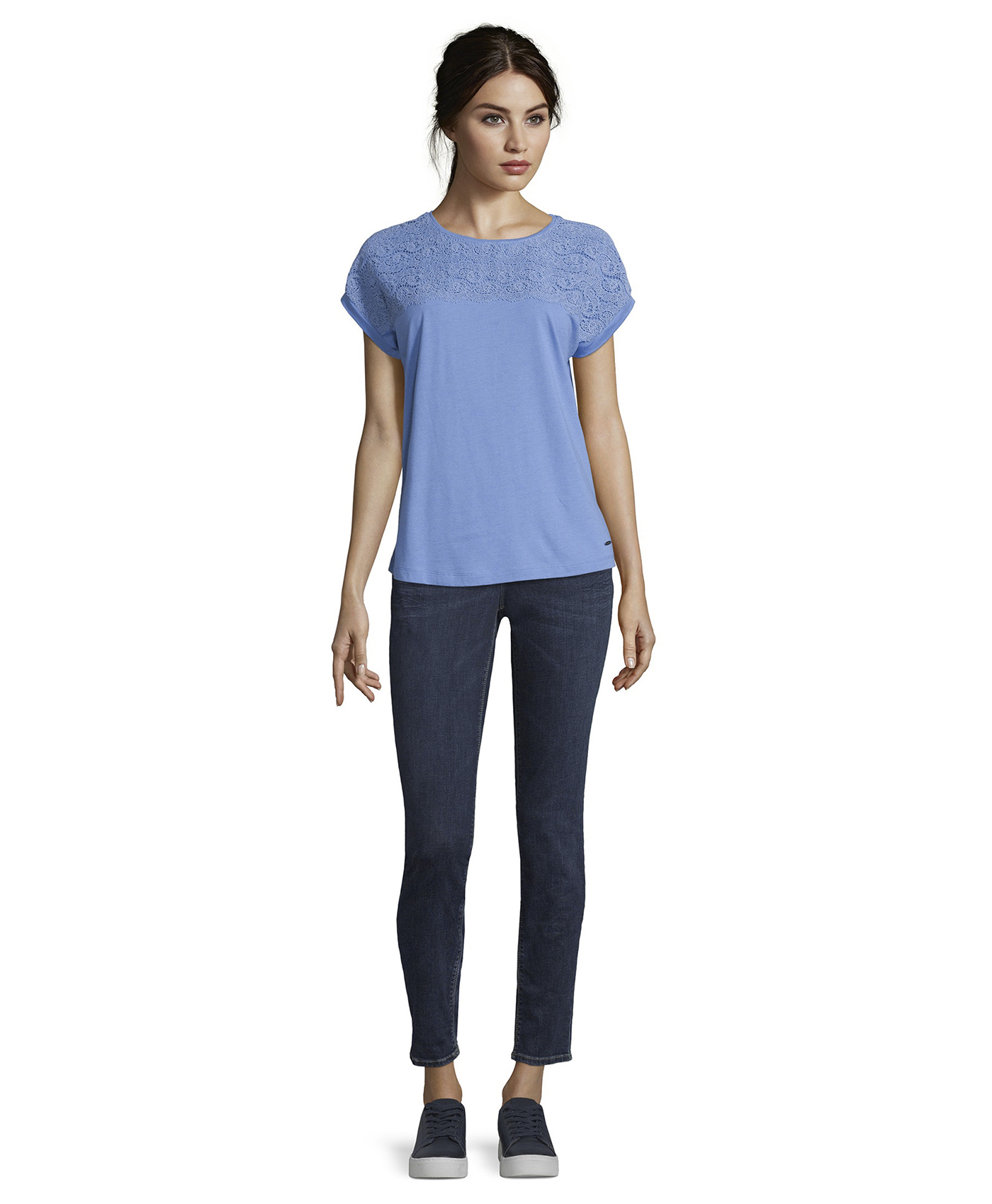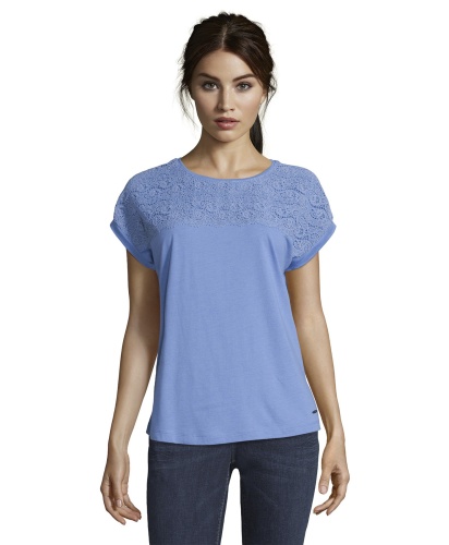 Топ свободного покроя. Кружевная кокетка на передней части изделия переходит в короткие рукава. Материал из смеси модала и хлопка приятен к телу и обеспечивает комфорт. Эта модель создает легкий и романтичный образ даже в брючном комплекте.