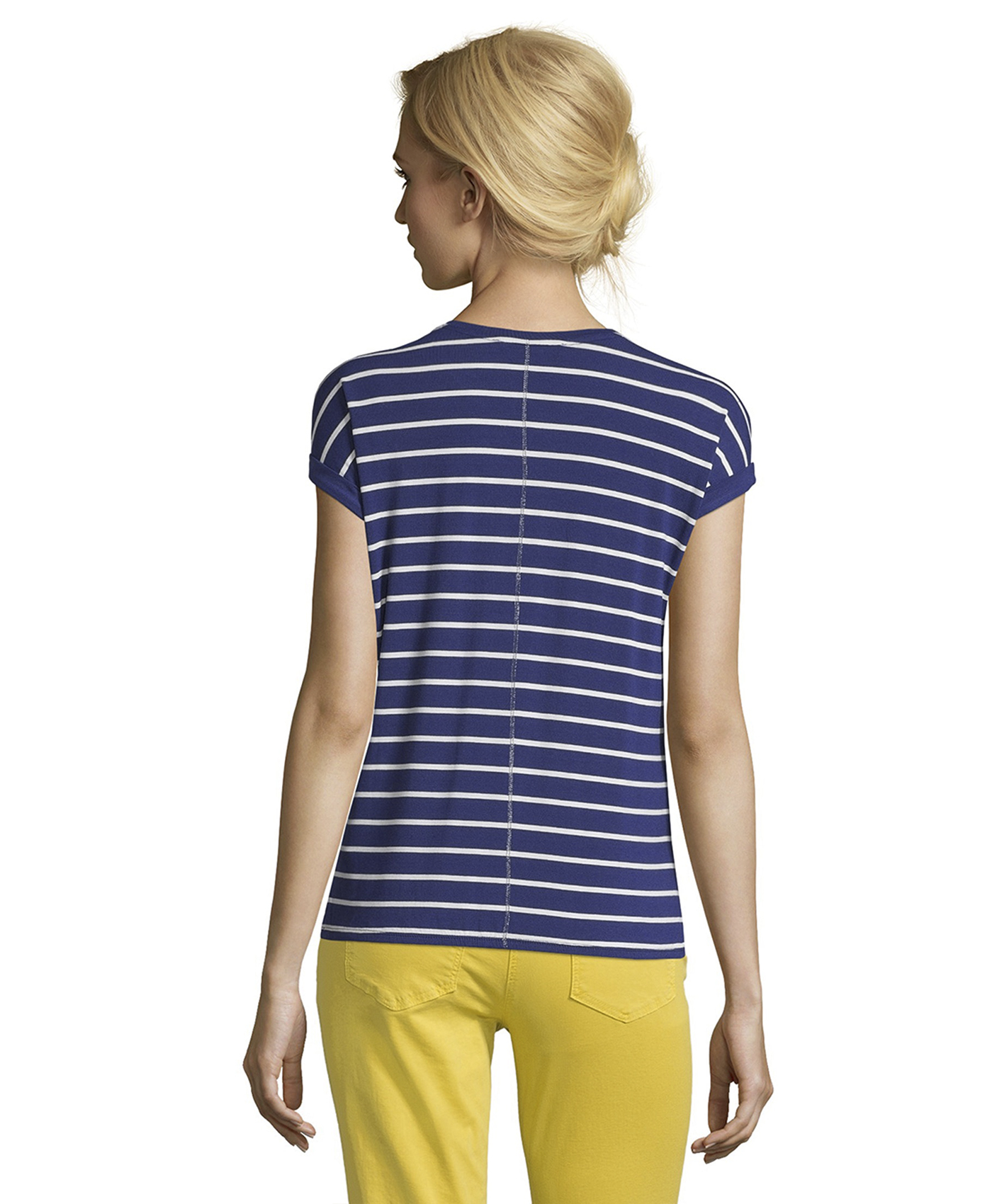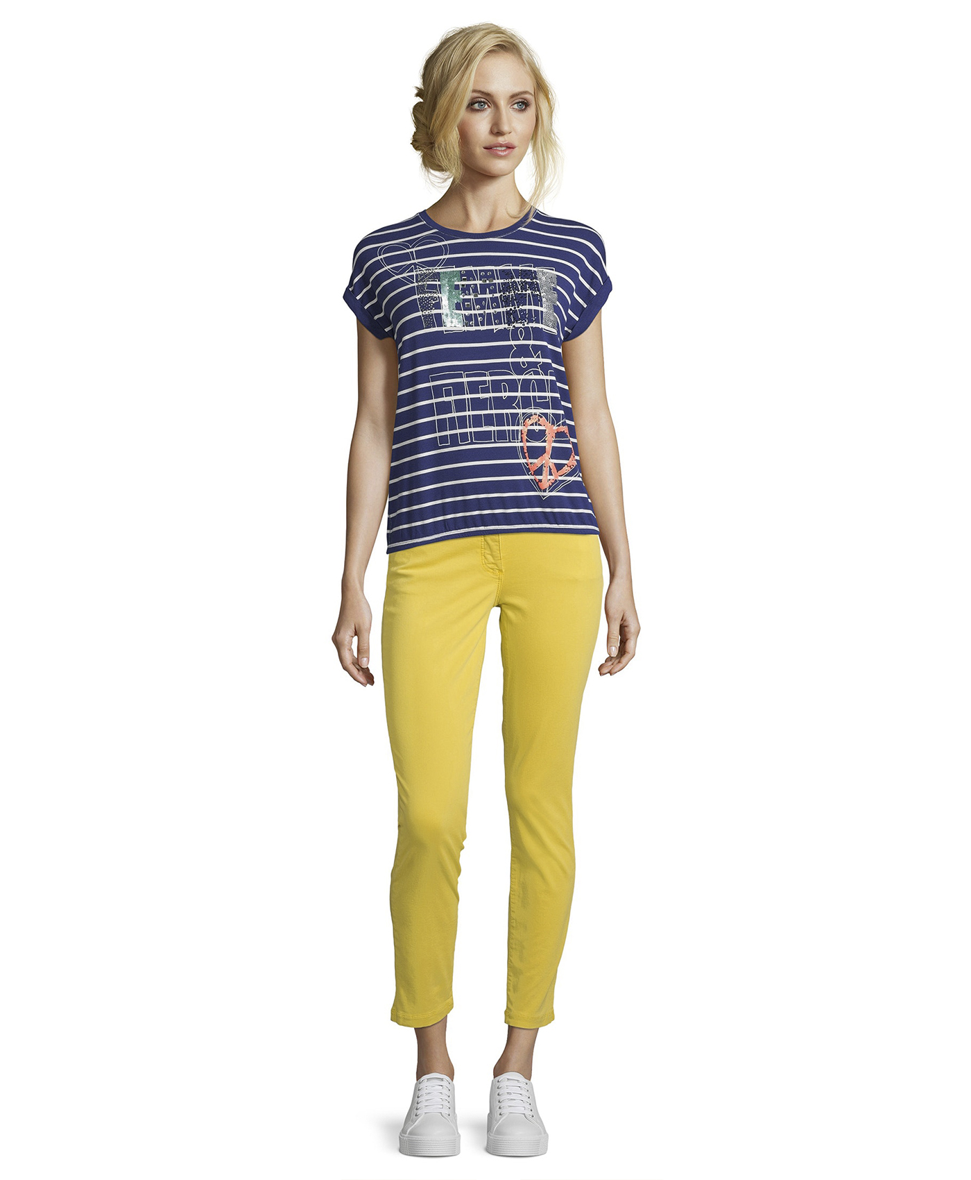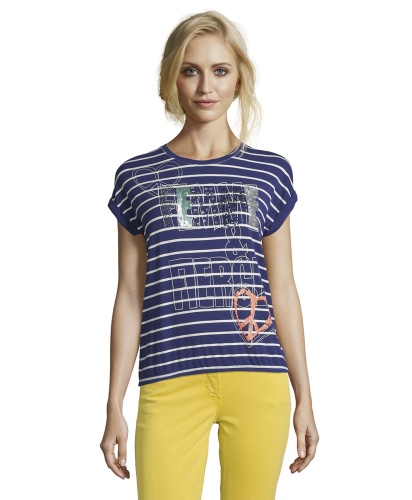 Новая интерпретация тренда на полоску! Полосатая футболка с принтом. Прямой покрой, круглый вырез гороловины. Короткие цельнокроеные рукава с фиксированными манжетами. Россыпь из страз и пайеток придает образу нотку гламура. Материал из вискозной смеси приятен к телу и обеспечивает комфорт. Эта футболка станет изюминкой множества образов в стиле кэжуал.