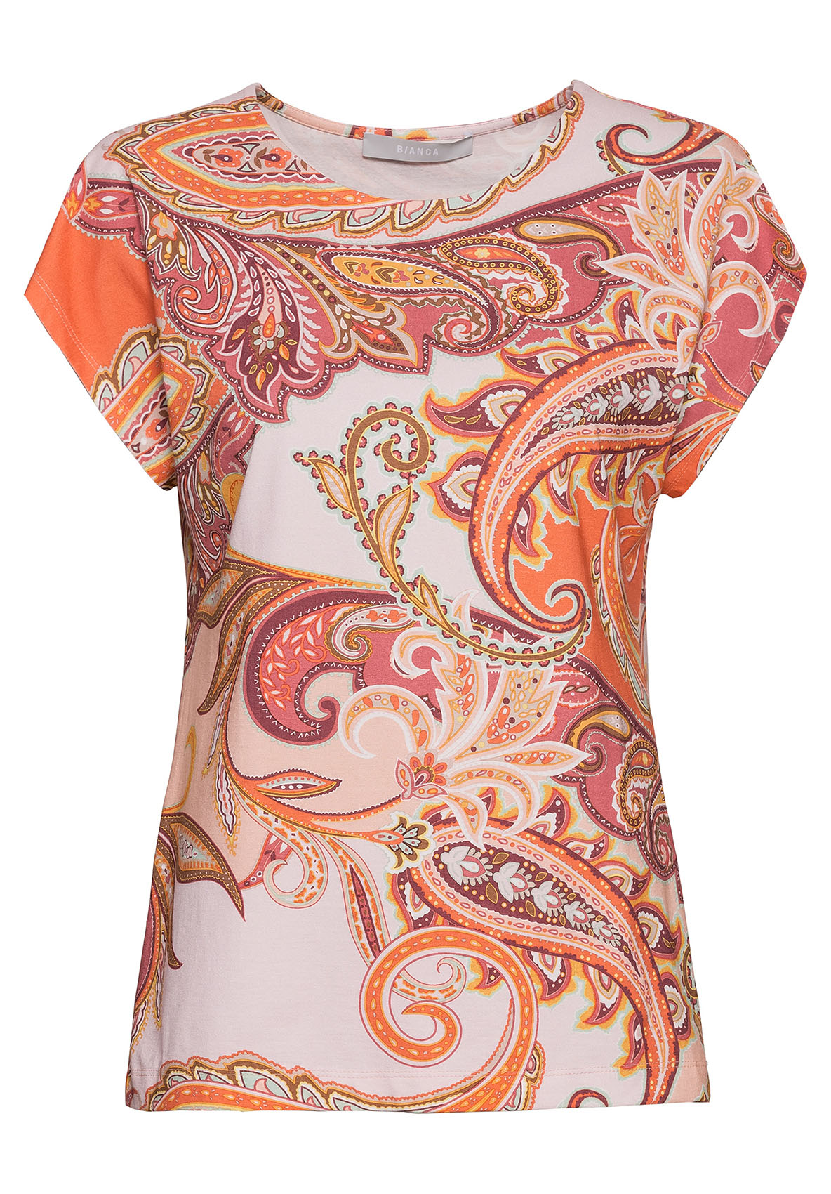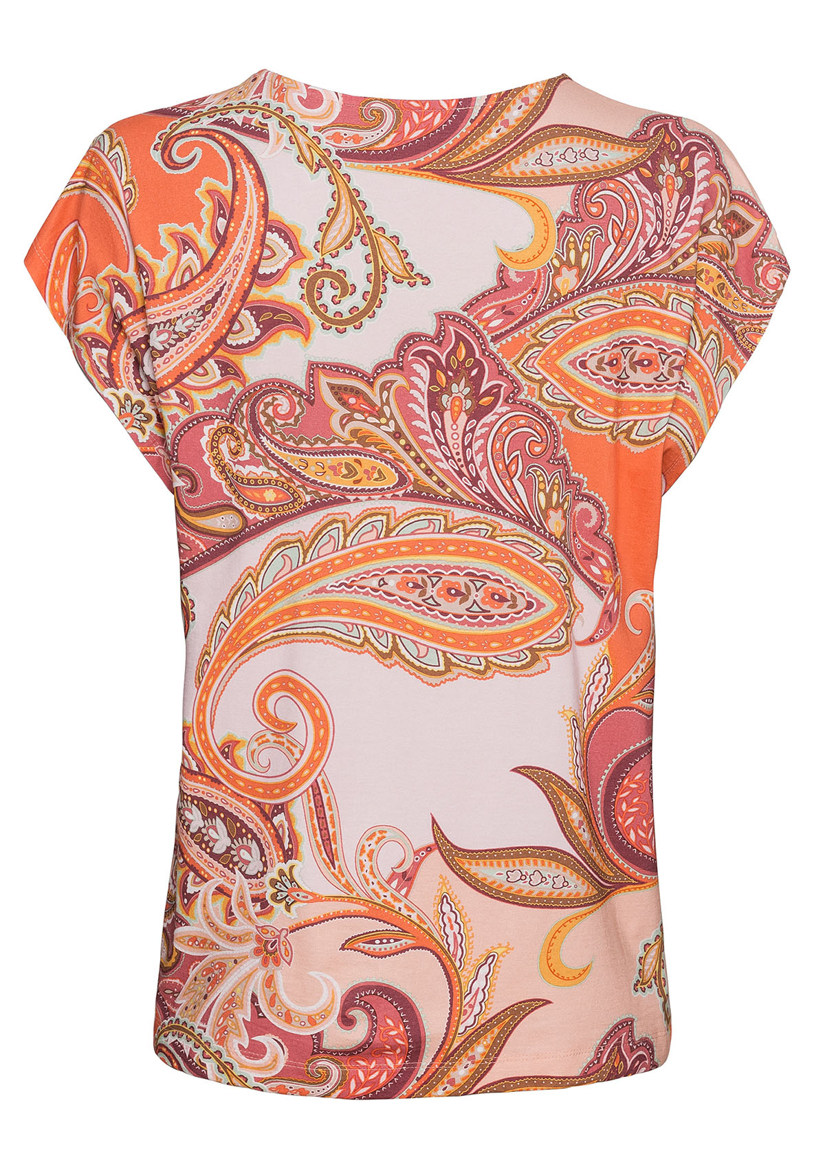 Раскрасьте лето с футболкой Julie! Принт "пейсли" в модных цветах заставит вас сиять! Футболка очень удобна в ношении благодаря материалу из смеси вискозы и эластана. Другие элементы дизайна футболки - цельнокроеные рукава, круглый вырез и слегка приталенный силуэт. Эта футболка - стильный компаньон для бесчисленных образов. • принт "пейсли" в модных цветах • мягкая вискозно-эластановая смесь • круглый вырез, цельнокроенный рукав • слегка приталенный силуэт • длина: около 64 см