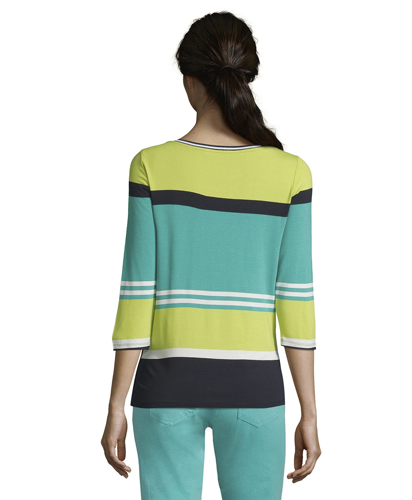 Футболка-лонгслив в полоску. Прямой покрой, вырез горловины "лодочка", рукава 3/4. Материал из вискозной смеси приятен к телу и обеспечивает комфорт. Эта футболка великолепно смотрится с любым однотонным вариантом низа, будь то брюки или юбка.