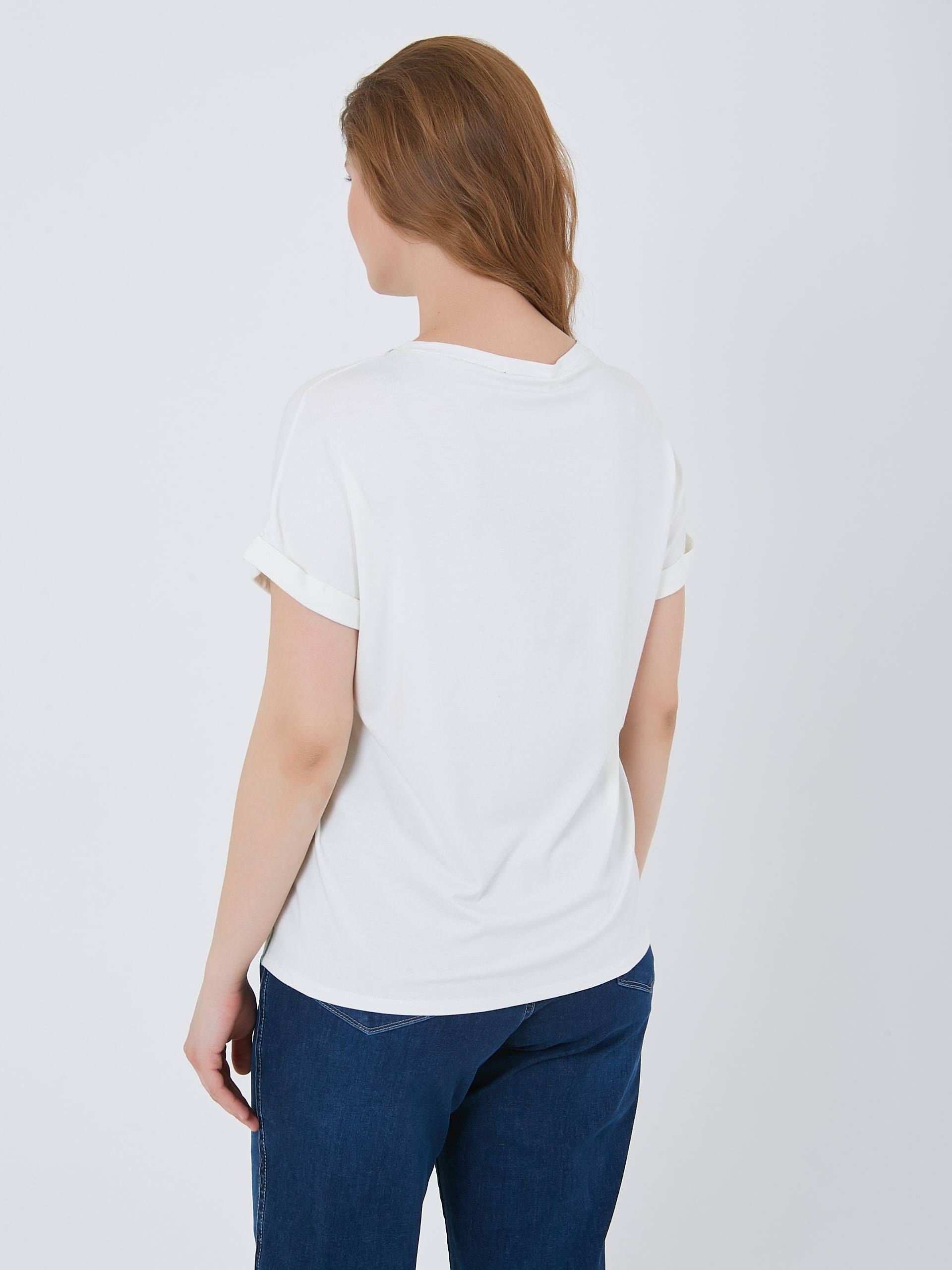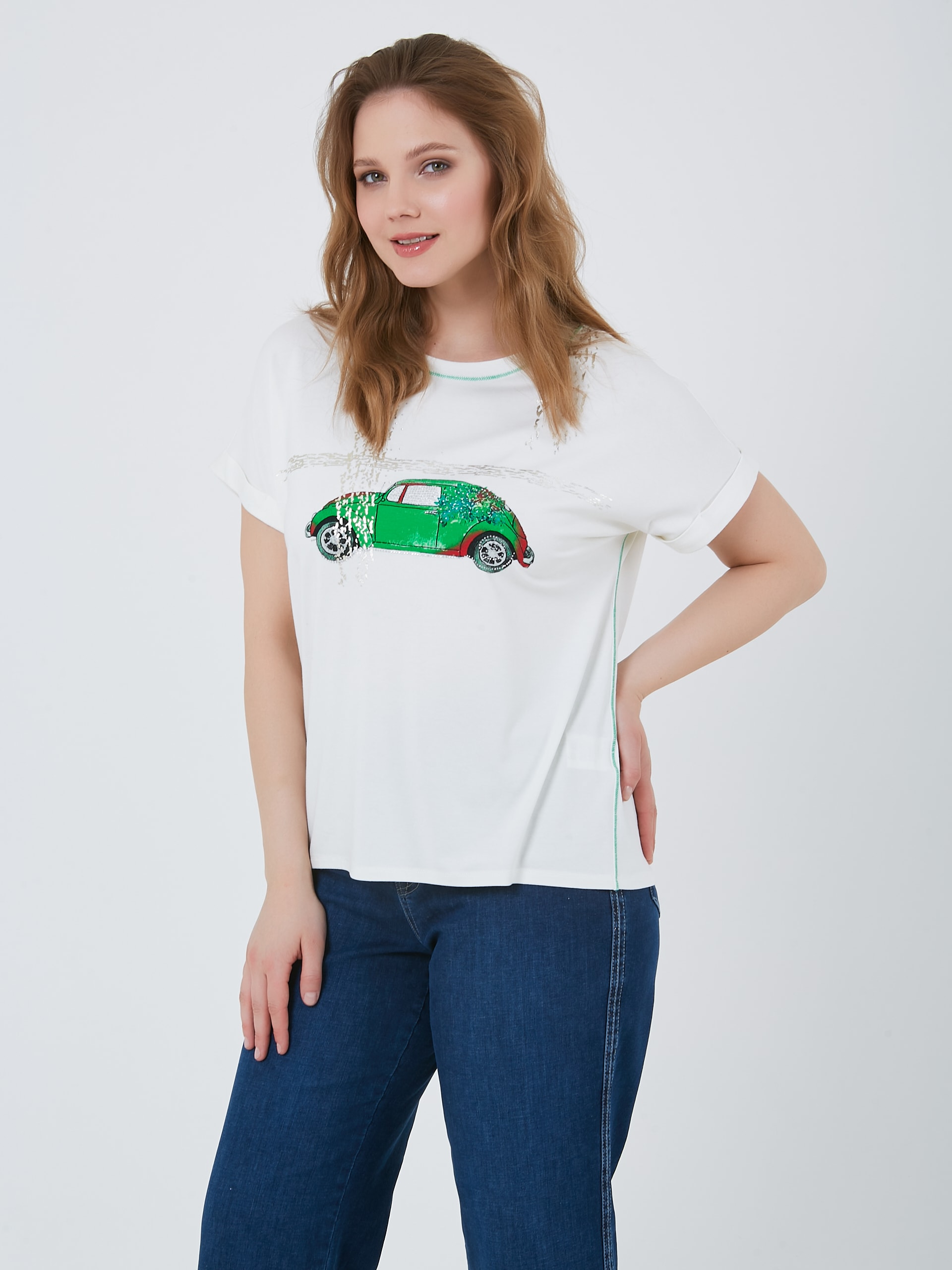 Футболка с изображением автомобиля с растительными мотивами и контрастной зеленой строчкой по бокам и на горловине. Весна-Лето 2025. Капсула "Марракеш". Параметры модели: 95-64-101, рост 175, размер 44-46