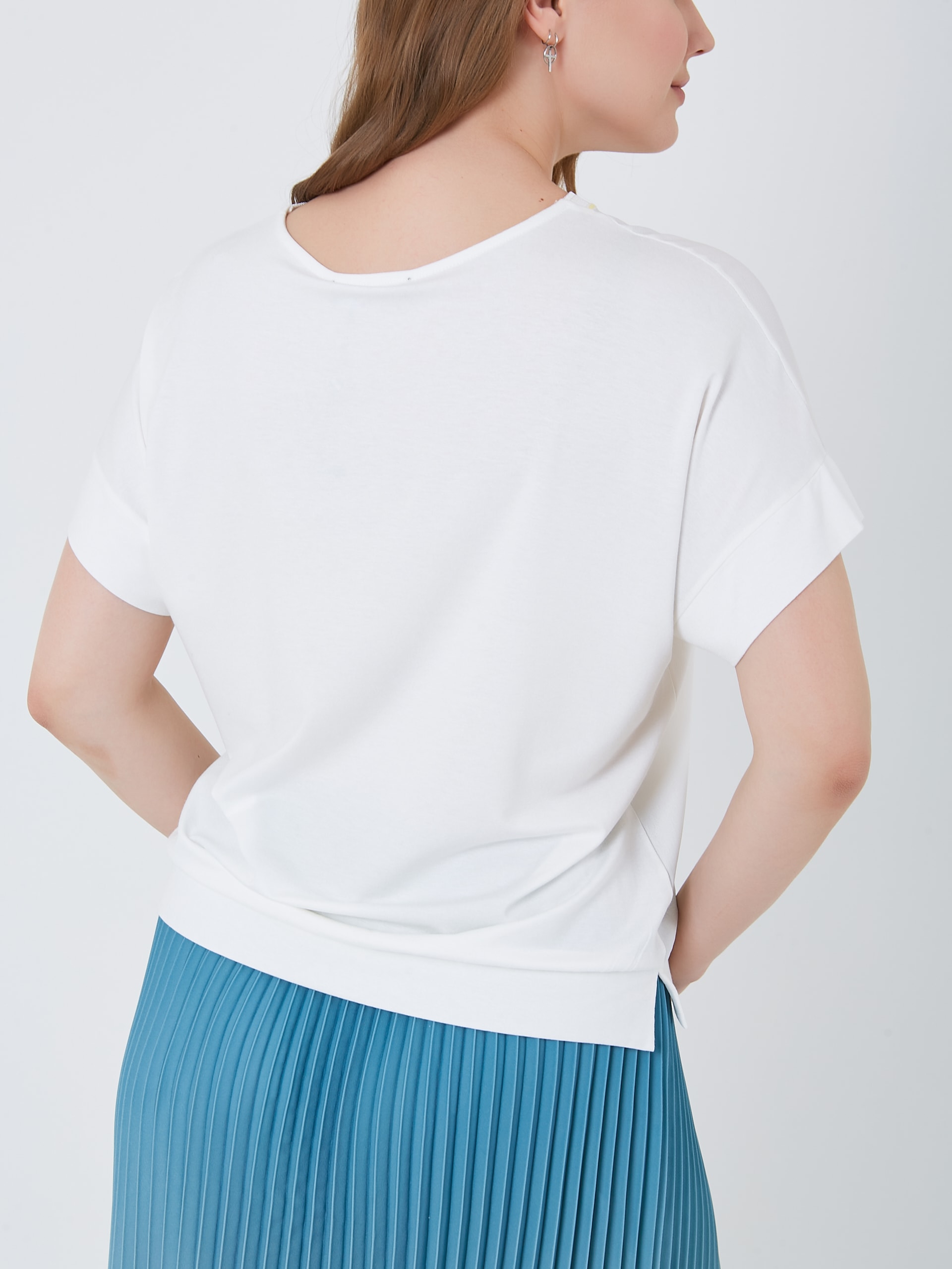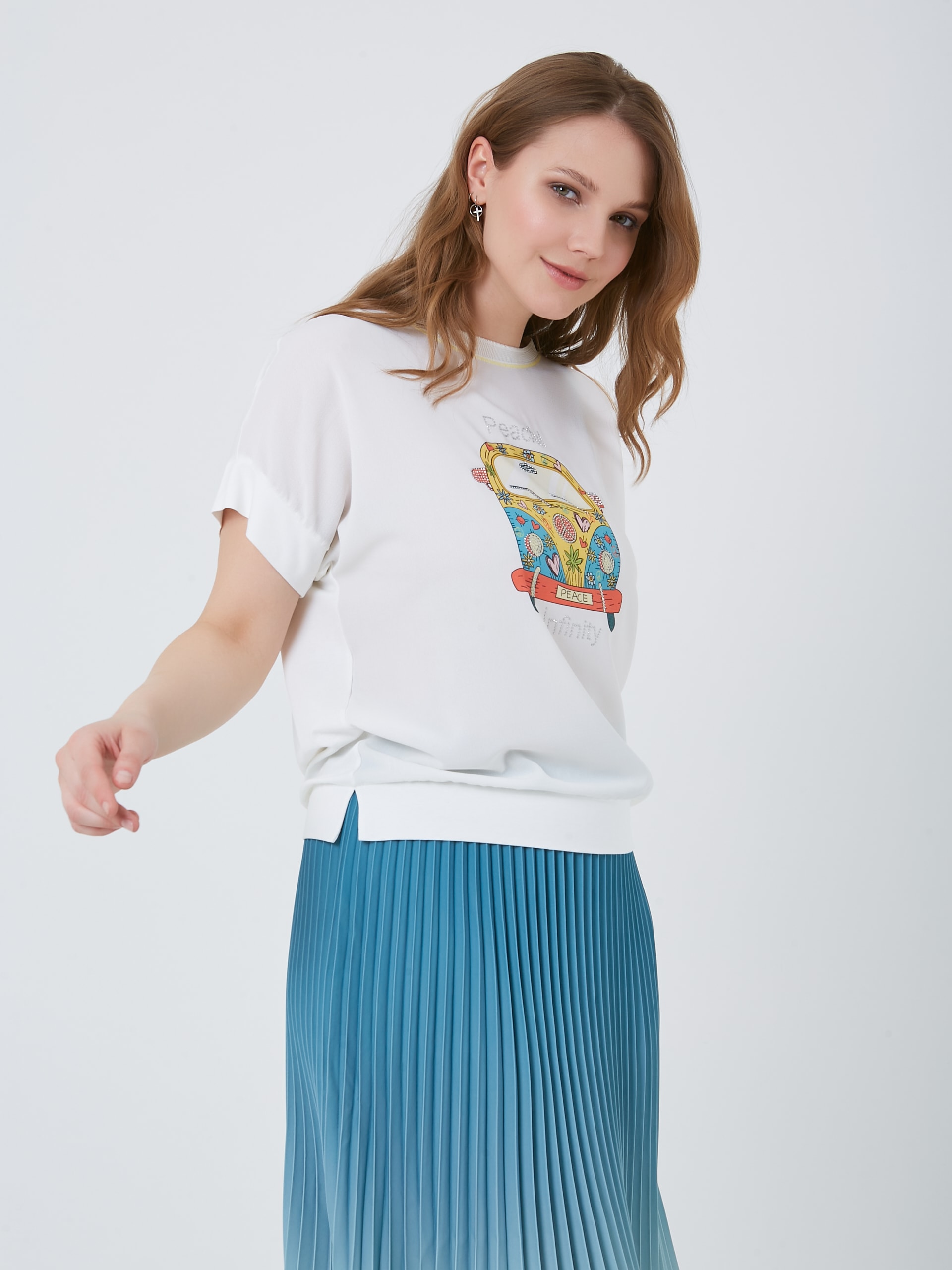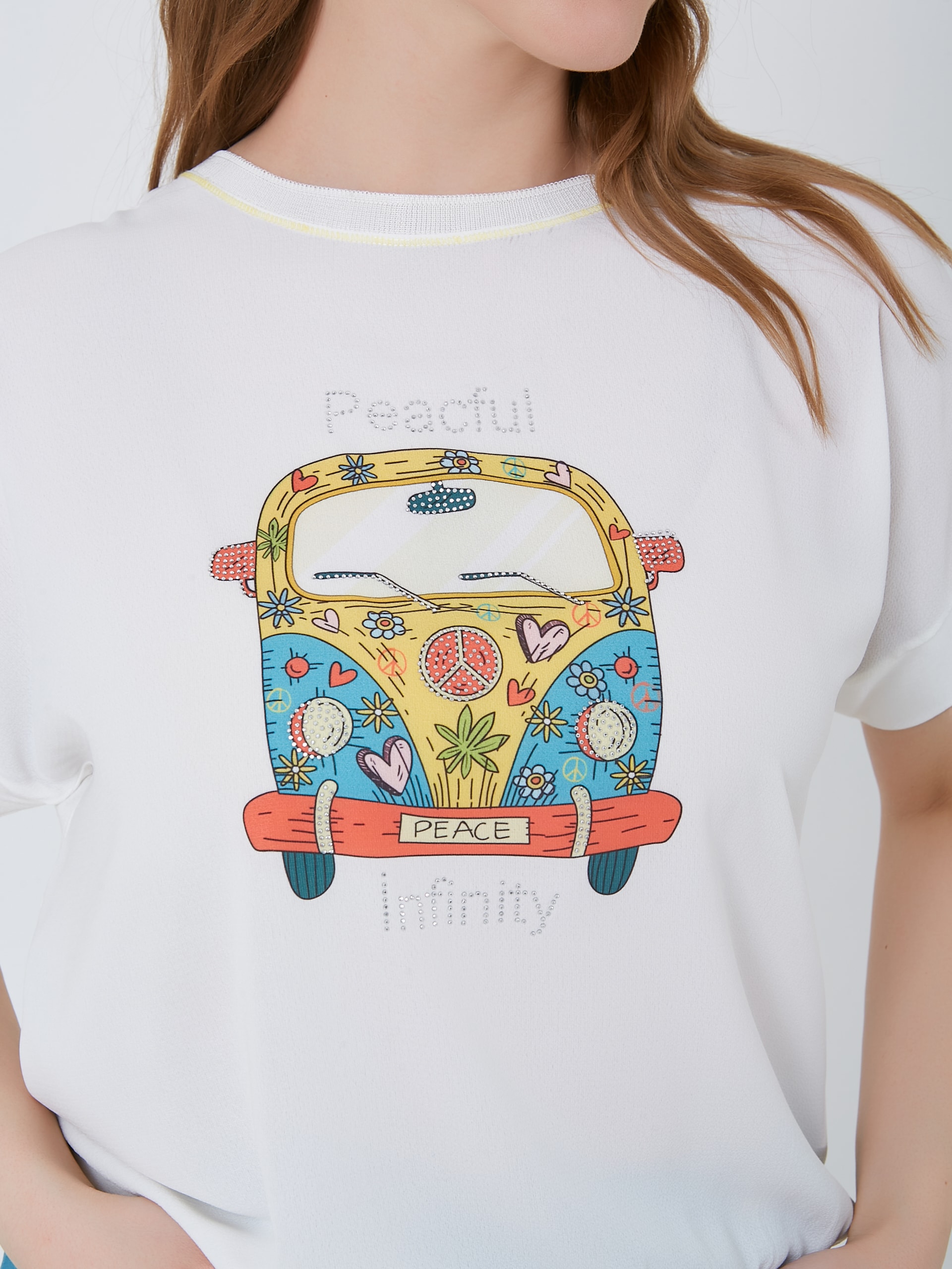 Базовая модель футболки с принтом цветочного авто с буквой S и выточками по бокам. Весна-Лето 2025. Капсула "Санторини". Параметры модели: 95-64-101, рост 175, размер 44-46