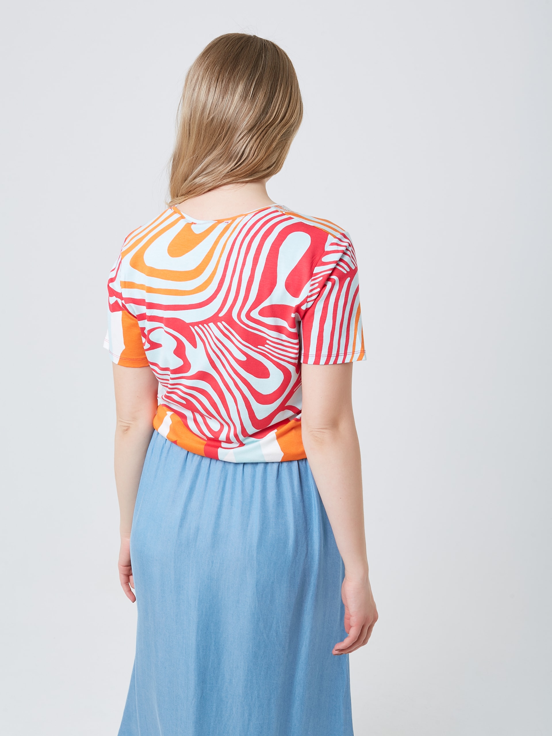 Футболка с ярким абстрактным узором в красных и оранжевых тонах, прекрасно дополнит летний образ и добавит яркости в гардероб. Весна-Лето 2025. Капсула "Санторини". Параметры модели: 89-70-92, рост 167, размер 44-46