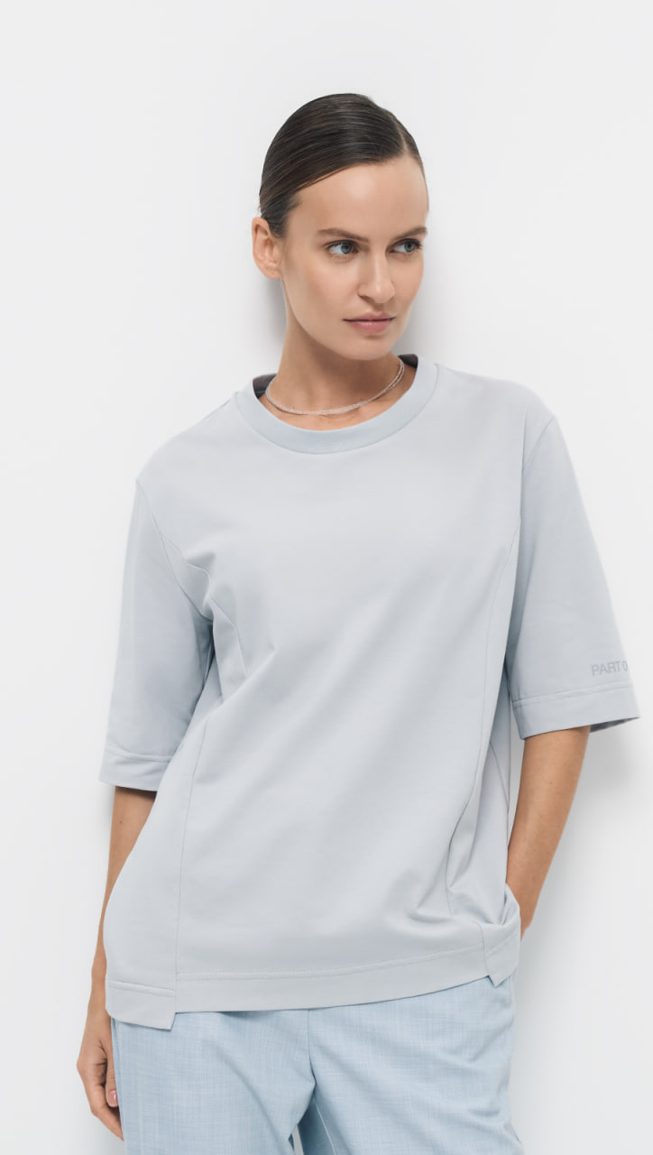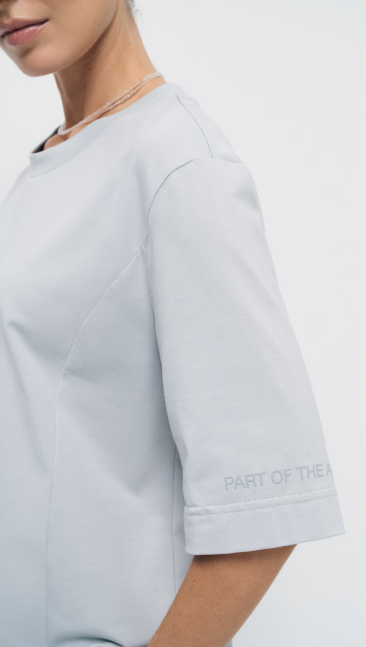 Блуза прямого силуэта из мягкого хлопка с добавлением эластана в спокойном цвете «серый мел» привлекает внимание благодаря своему уникальному дизайну. Полочка украшена двумя вертикальными рельефами, в которые заложена нагрудная вытачка, подчеркивающая изящную линию груди. Втачные одношовные рукава, длиной чуть ниже линии локтя, дополняют гармоничный силуэт и делают образ элегантным и утонченным. Объемная печать на рукаве, выполненная в тон основному материалу, несет в себе девиз коллекции, придавая изделию особую значимость и индивидуальность.