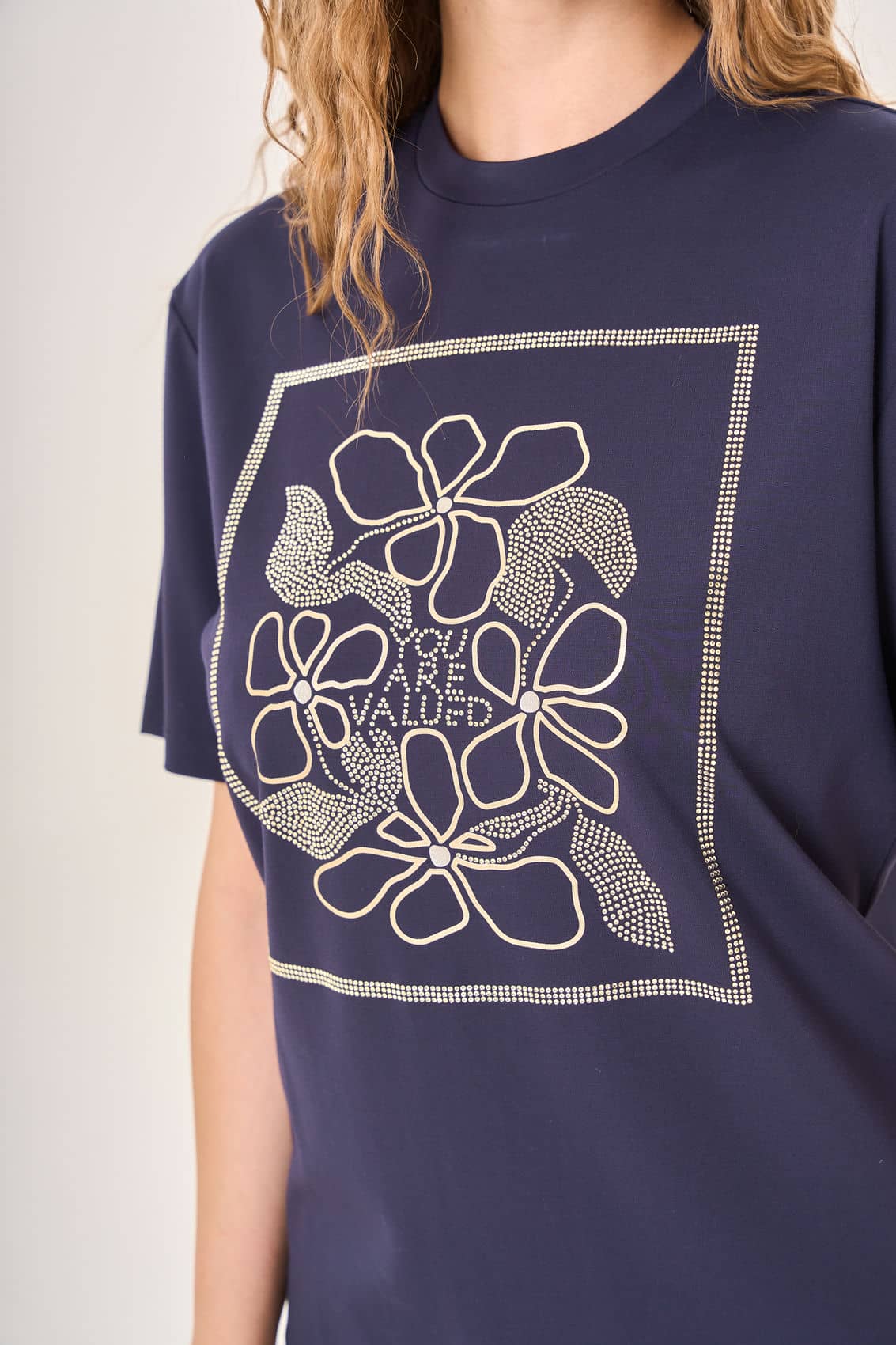 Футболка обладает классическим втачным рукавом и выполнена из более плотного трикотажа, чем летние варианты. Благородный чернильно-чёрный оттенок выгодно подчёркивает оригинальную аппликацию из золотых страз, придавая изделию дороговизну и шик. Футболка подойдёт женщинам разных фигур, идеально вписываясь в городской стиль и позволяя создать стильный и утончённый образ.