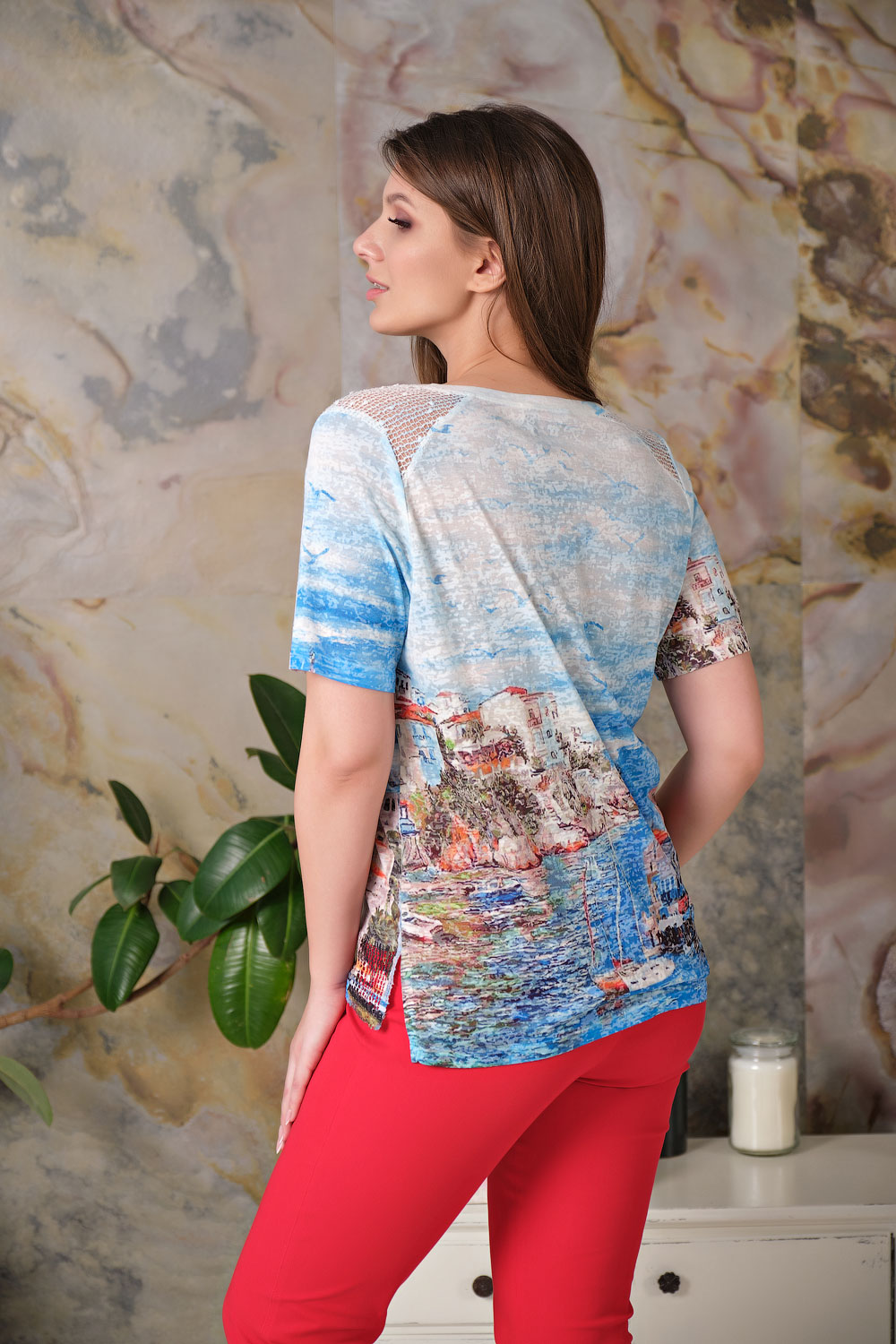 Футболка из мягкой и приятной к телу ткани. Интересная фактура ткани позволяет создать необычный образ. Прямой покрой не сковывает движения и скрывает недостатки фигуры. Круглый вырез горловины. Футболка украшена декоративными вставками на плечах и по нижней части переда. Разрезы по бокам, удлиненная спинка. Яркий принт с морскими мотивами. Данная футболка будет удачно сочетаться с брючным комплектом.