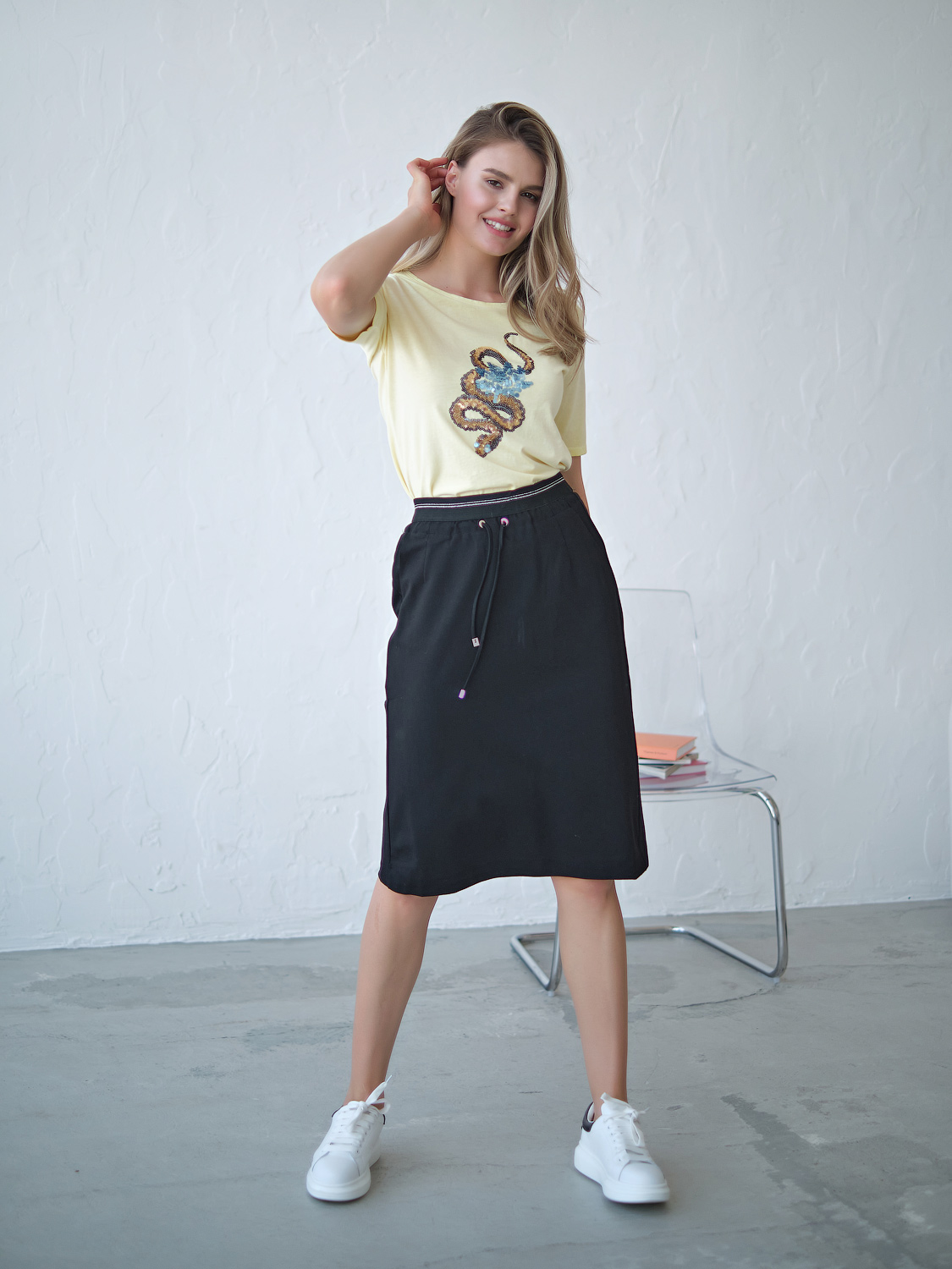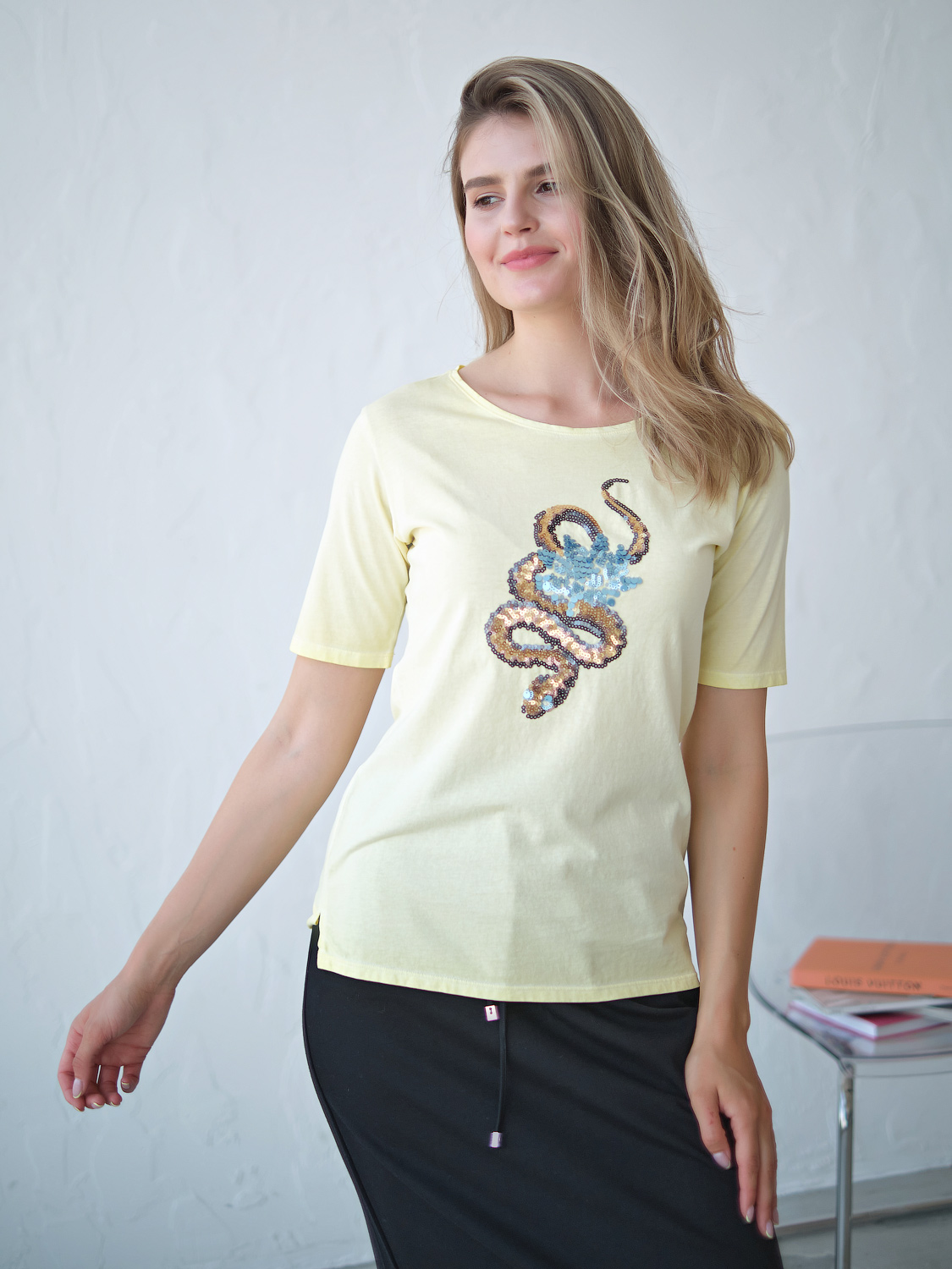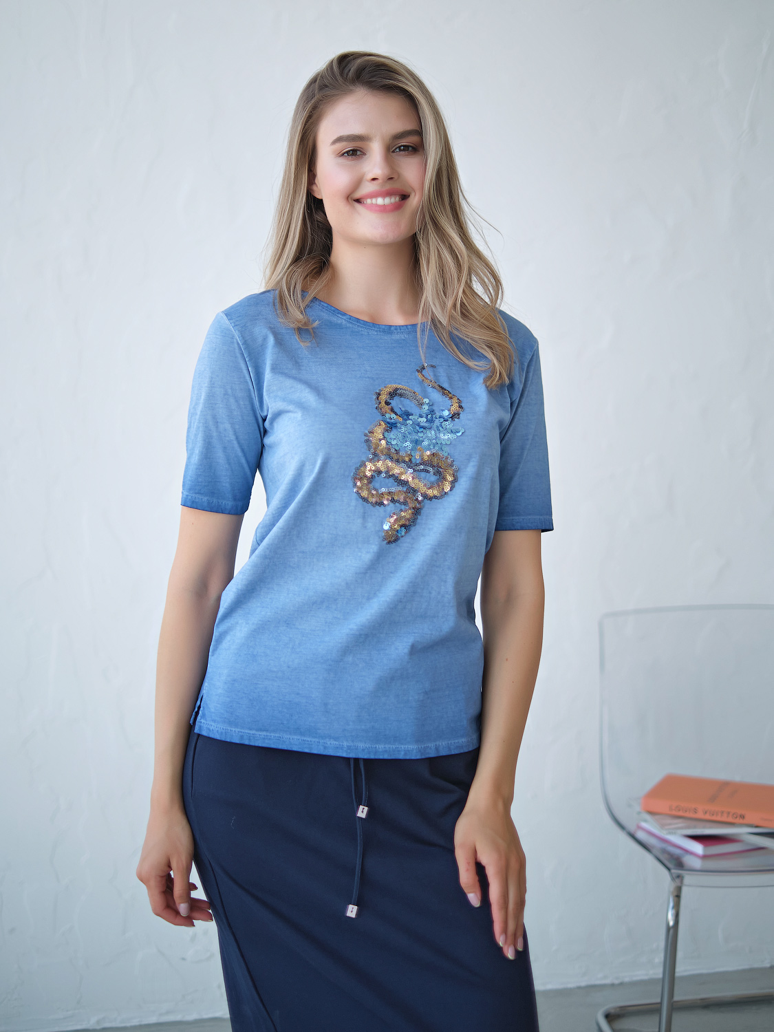 Ткань из натуральных материалов обеспечит комфорт и прохладу жарким летом. Прямой покрой скроет недостатки фигуры. Круглый вырез горловины создает женственный образ. Футболка украшена вышивкой из пайеток. Данная модель будет хорошо сочетаться с брючным комплектом.