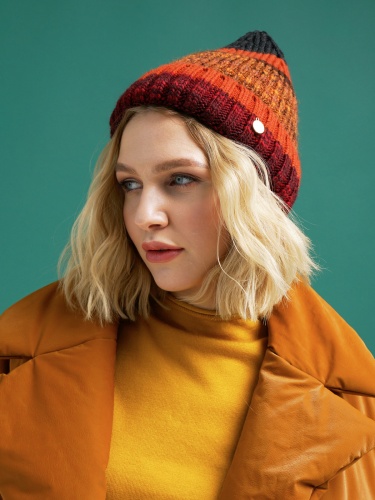 Вязаная шапка в насыщенном оранжевом оттенке добавит акцент в образ. Материал из смесовой шерсти хорошо сохраняет тепло и держит форму. Украшение в виде металлического лейбла.