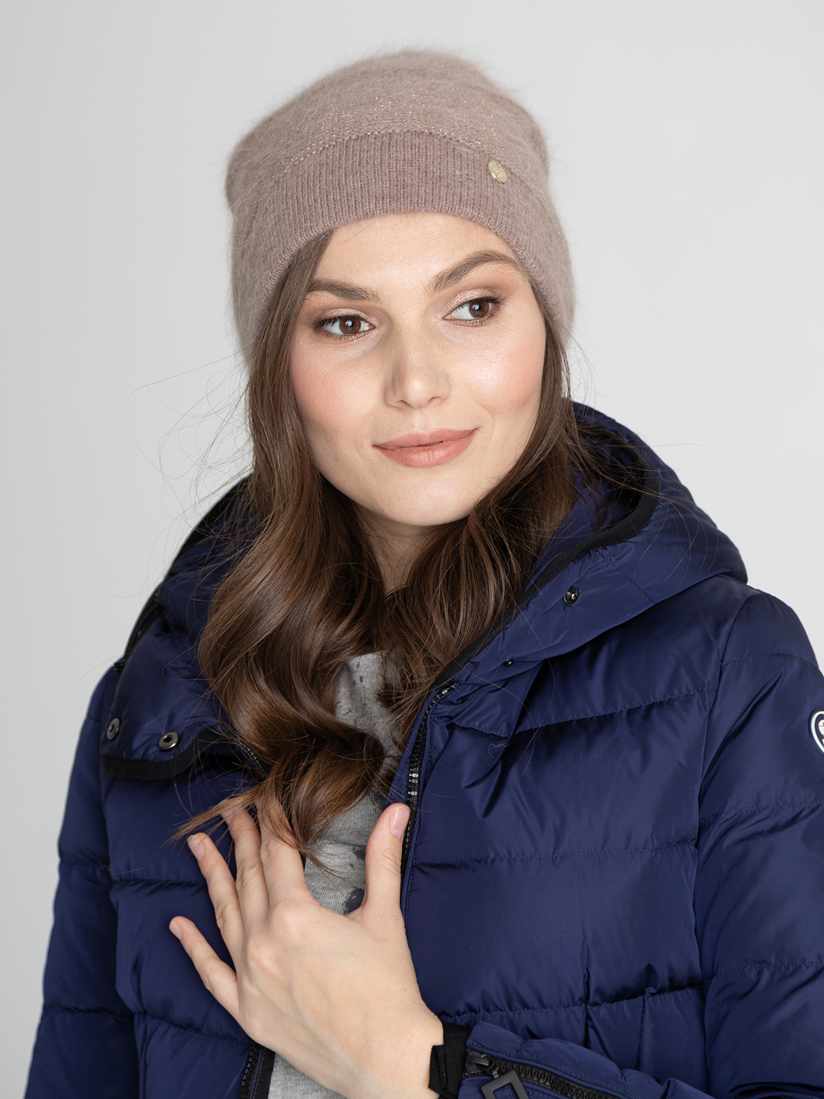 Однотонная шапочка-бини из ангоры с добавлением смесовой шерсти. Нить люрекса обеспечивает приятный блеск. Шапка хорошо сохраняет тепло и подходит для любого овала лица.