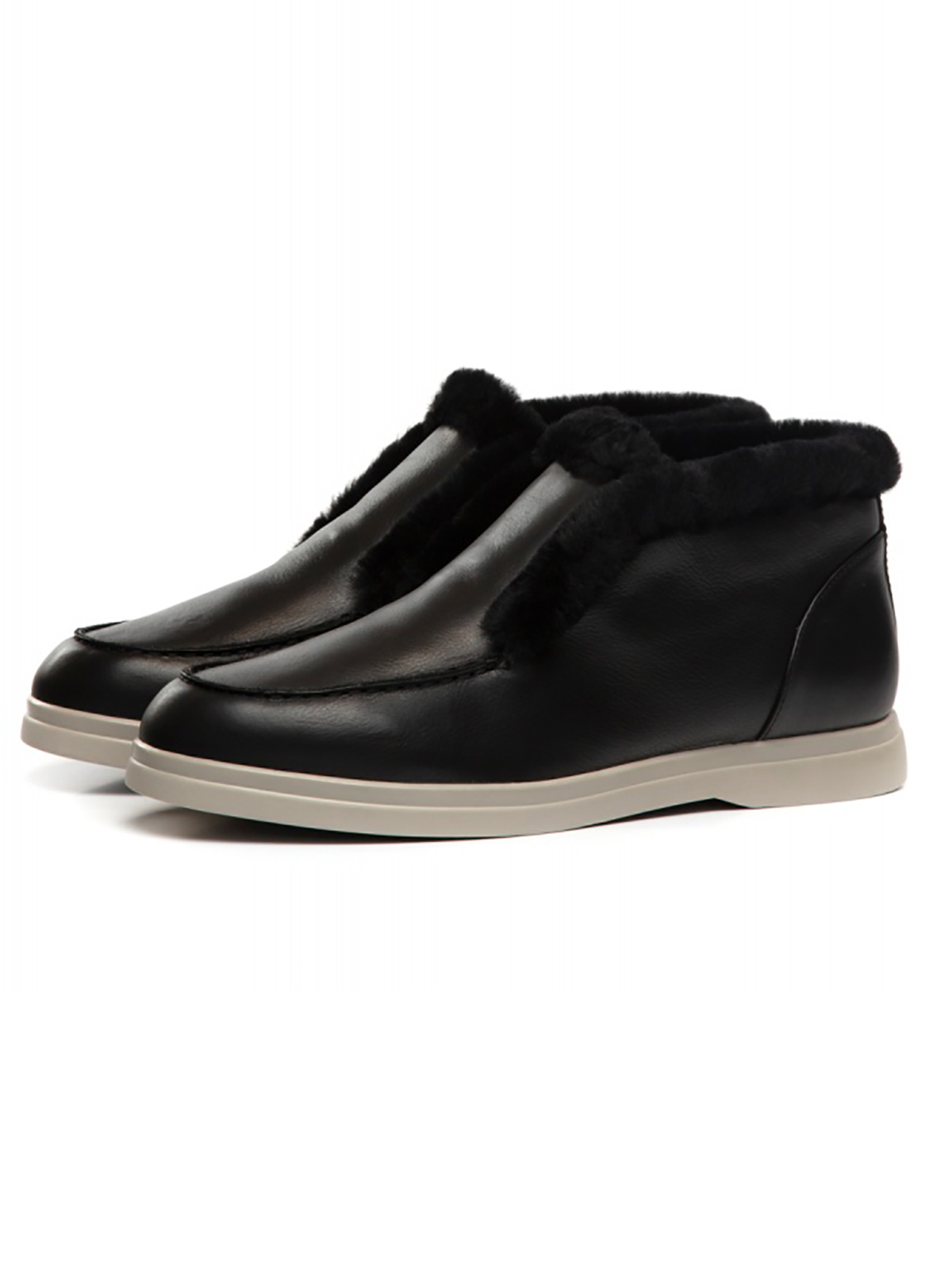 Короткие зимние ботинки из велюра черного оттенка на плоской контрастной подошве. Оторочка из натурального меха в тон. Ботинки отлично дополнят повседневный образ из теплого спортивного костюма, также выигрышно будут смотреться с джинсами или джоггерами.