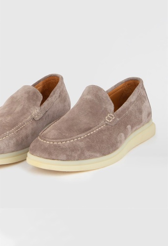 Серо-бежевые замшевые кожаные женские лоферы. Изготовлено из высококачественной телячьей кожи. Bысота подошвы: 2 см. Резиновая подошва. Ручная работа.