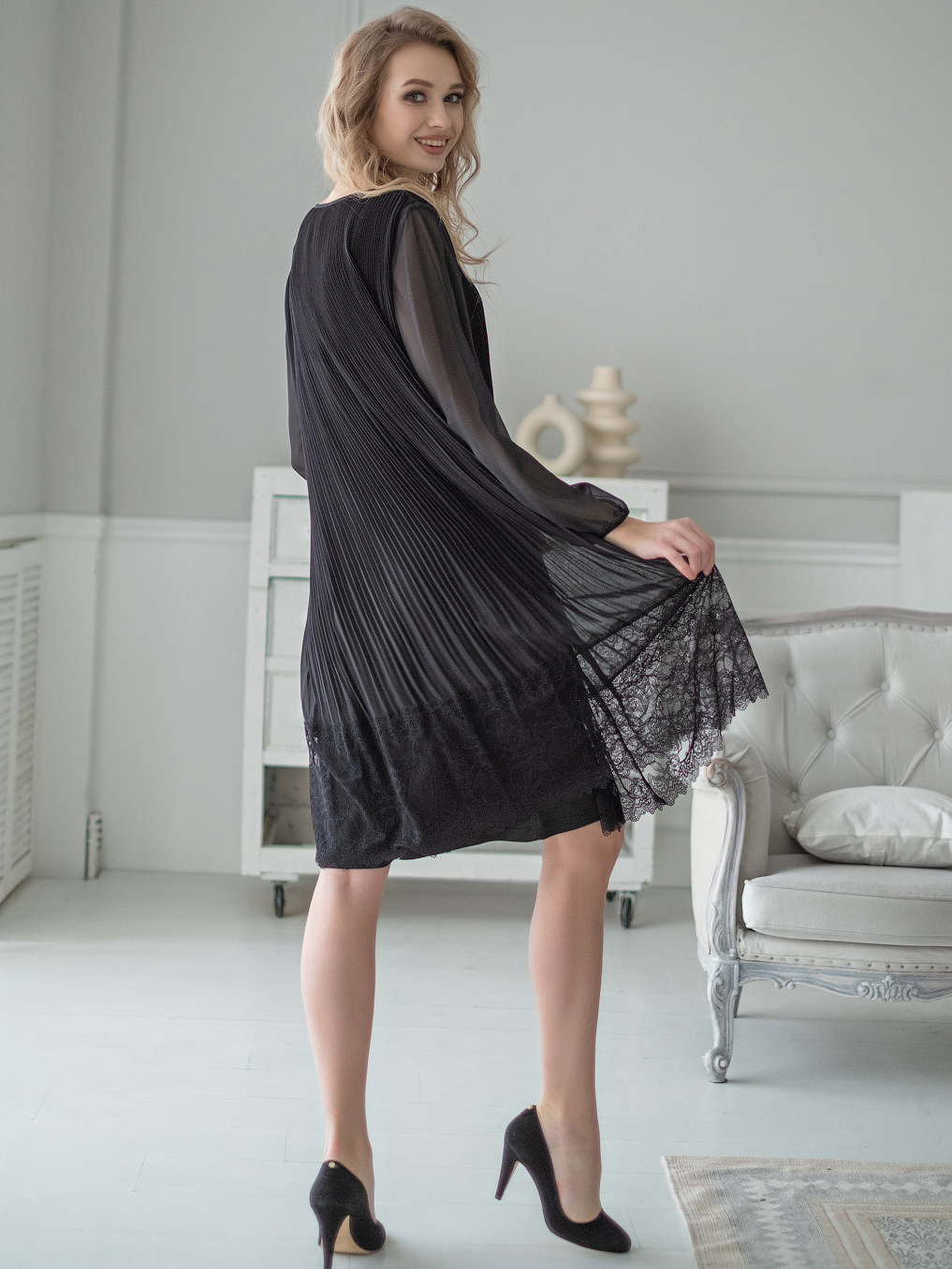 Плиссированное платье-трапеция, украшенное кружевом по низу изделия, идеально сгладит любые недостатки фигуры и подчеркнет достоинства. V-образный вырез, рукав епископа, длина платья – до середины колена.