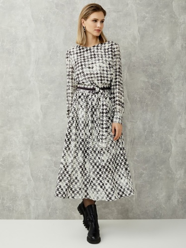 Платье длины миди в узоре «гусиная лапка». Полуприталенный силуэт, втачной рукав полной длины, вырез горловины лодочка. В комплекте идет пояс из эко-кожи. Платье подходит как для повседневного ношения, так и для праздничного наряда.