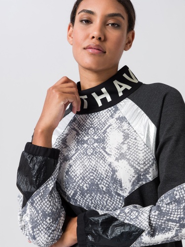 Стильное экстравагантное платье в спортивном стиле со вставками в питоновом узоре и экокоже. Длина мини, полуприталенный силуэт. Широкий воротник стойка украшен надписью.