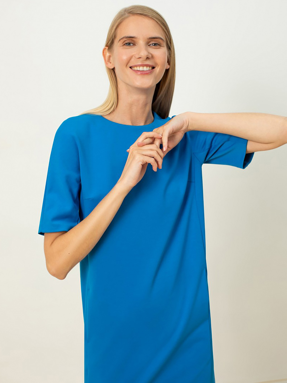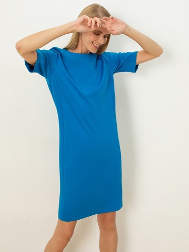 Однотонное платье прямого кроя с круглой горловиной, коротким рукавом кимоно и рельефами на спинке и переде.