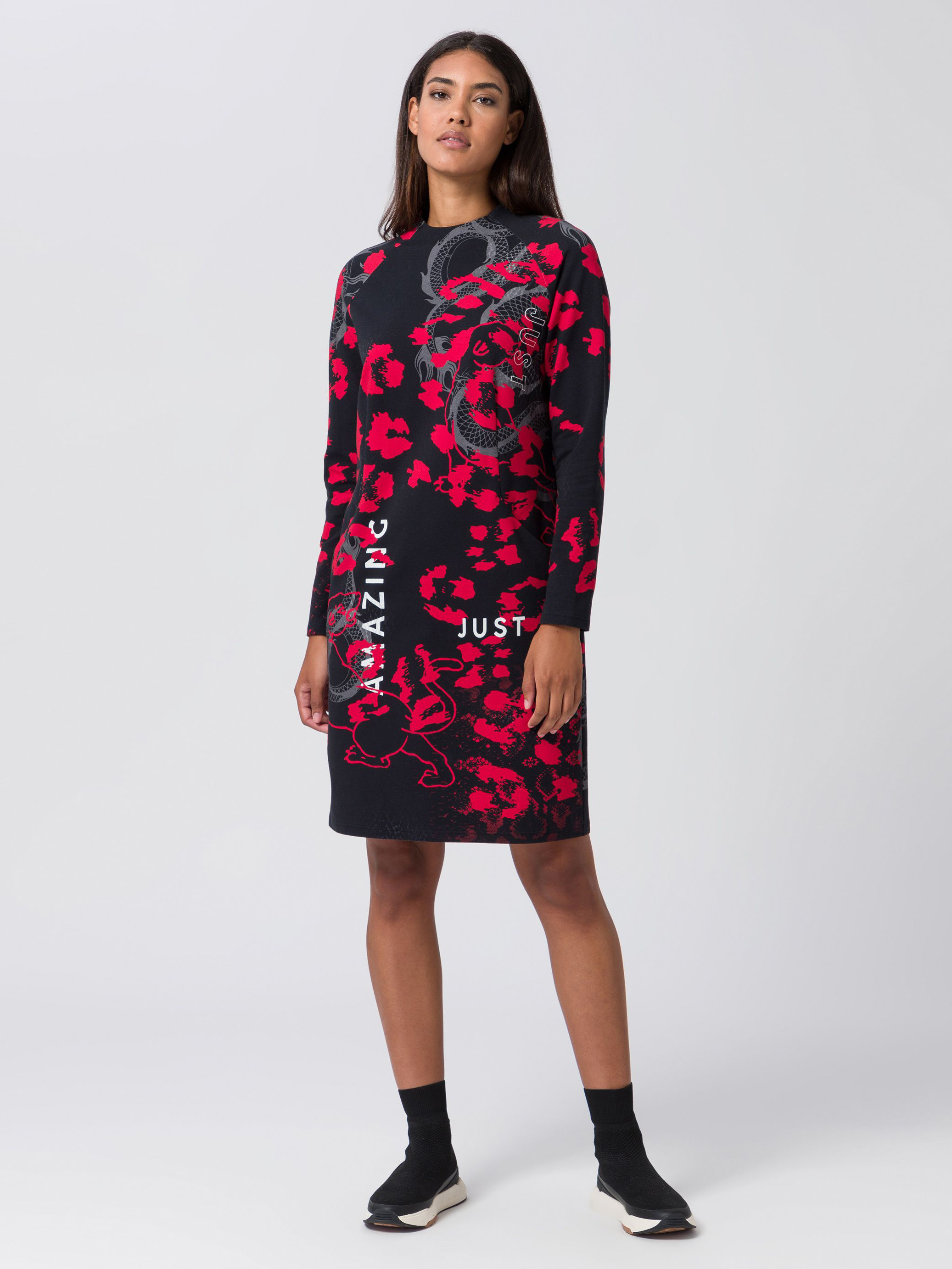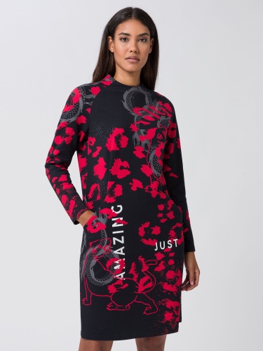 Платье прямого кроя с красным леопардовым принтом со сдержанными животными мотивами красиво прилегает к телу. Воротник-стойка, длинные втрачные рукава.