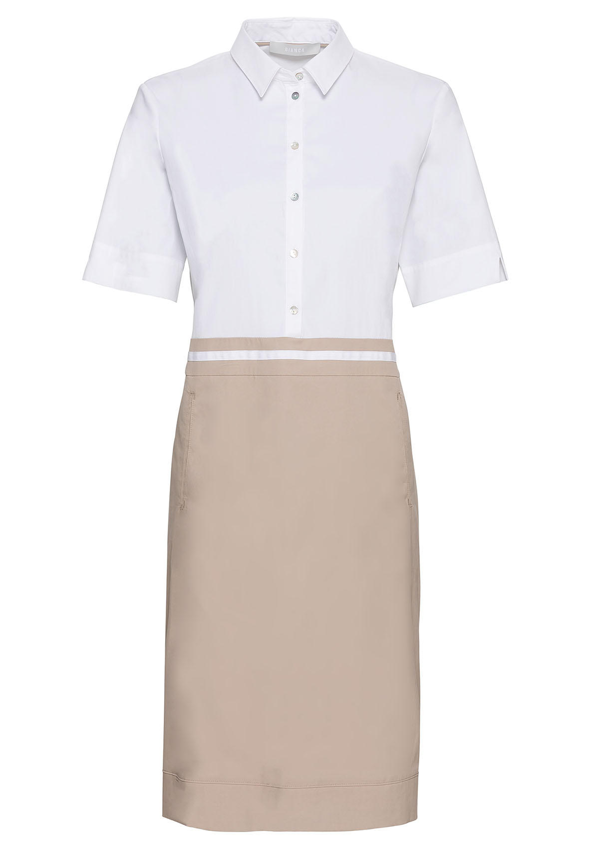 Стильное платье-рубашка Arina создает образ, спортивный и элегантный одновременно. Особенность платья в том, что оно оптически разделено на блузку и юбку. Верхняя часть выглядит как белая блуза с коротким рукавом и пуговичной планкой. А прямая юбка выполнена в бежевом цвете. Белая полоса на талии подчеркивает женственный силуэт. Смесь хлопка с эластаном очень мягкая и удобна в ношении. Два боковых кармана придают платью непринужденный вид. Будь то важная встреча или экскурсия по городу - в платье Arina вы будете выглядеть прекрасно! • двухцветное платье-рубашка • качественный материал из смеси хлопка и эластана • рукав 1/2, пуговичная планка до талии, два боковых кармана • длина юбки около 58 см, рост нашей модели около 180 см • при росте 168 см платье будет длиной до колен