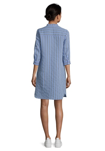Платье в трендовом полосатом принте. Длина чуть выше колена, силуэт трапеция. Круглый вырез горловины, декоративная складка спереди, рукава 1/2 на манжетах, кокетка на спинке, небольшие разрезы по бокам, закругленный низ изделия. Приятный к телу материал из смеси модала и полиэстера. Это платье обеспечивает создание стильного образа как с туфлями на каблуке, так и со спортивной обувью.