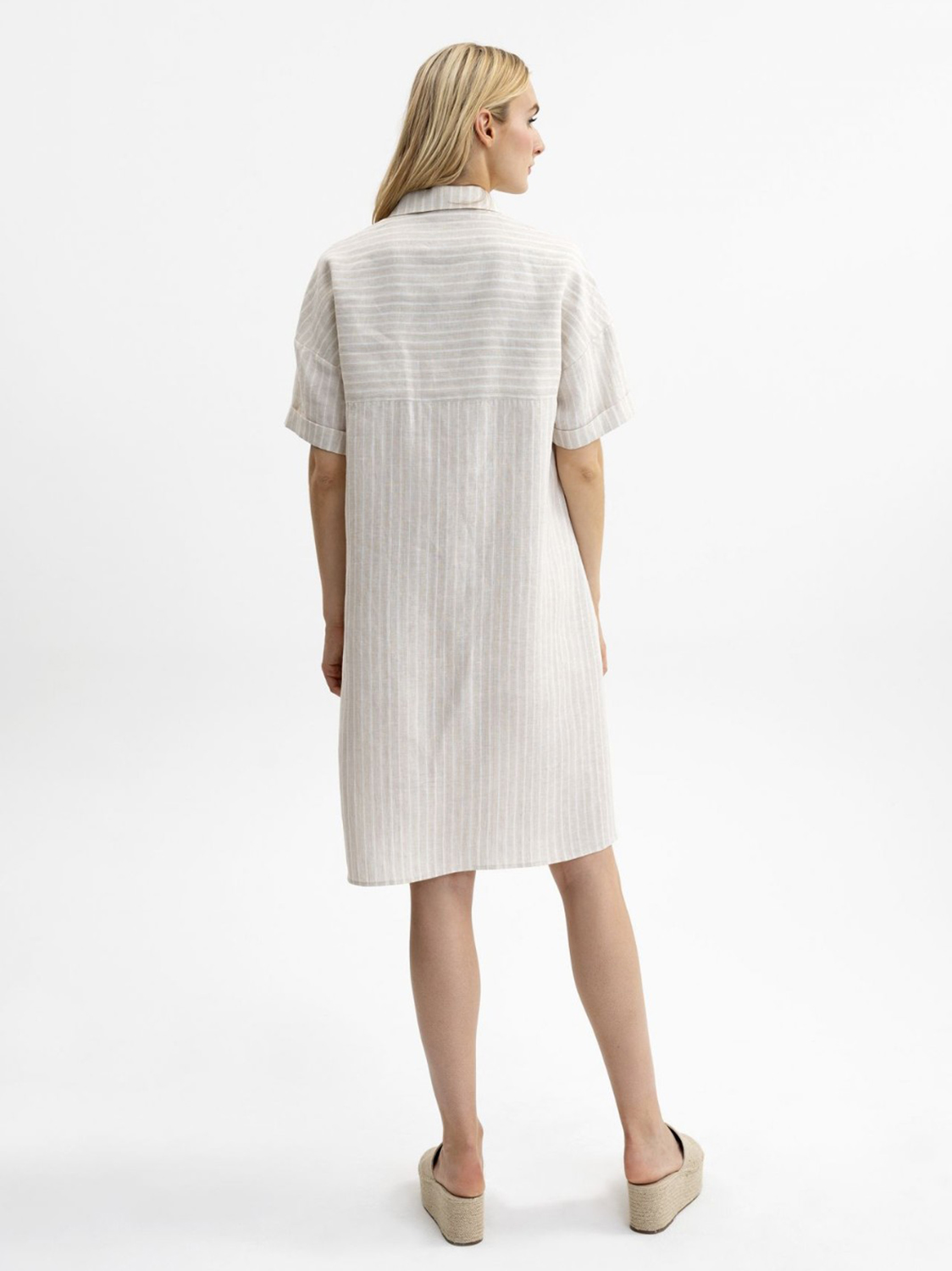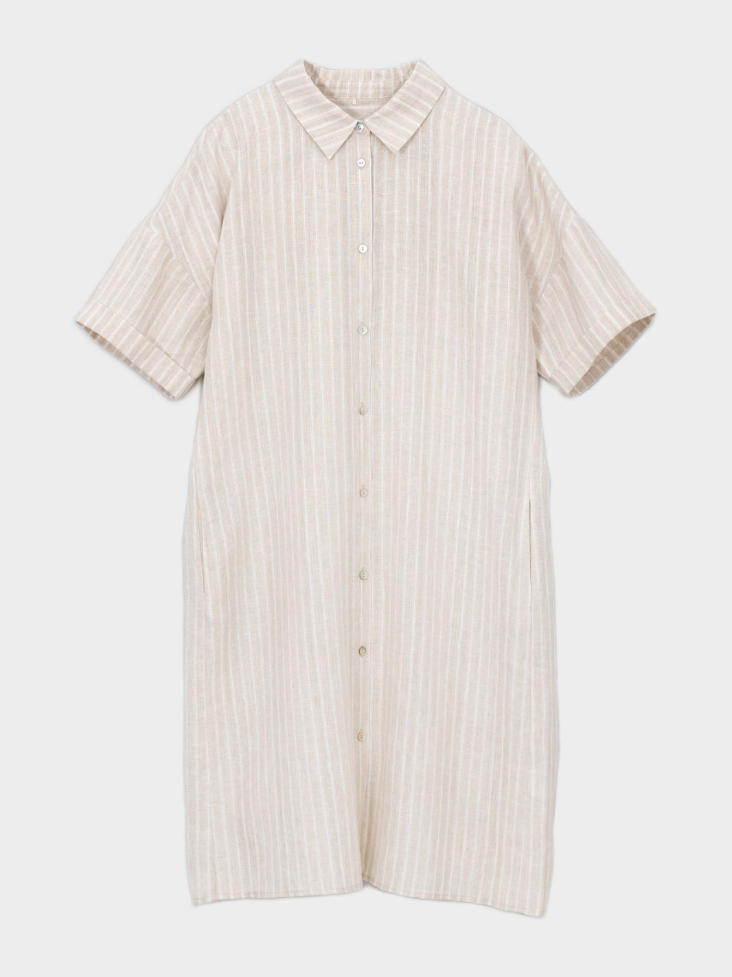 Льняное платье-рубашка свободного кроя. Длина миди. Отложной рубашечный воротник. Короткий втачной рукав с отворотом. Застежка на пуговицы.