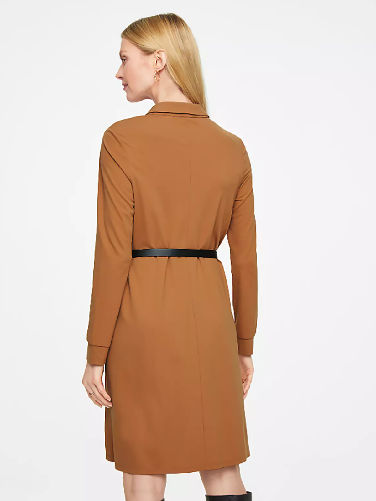 Однотонное платье-рубашка длиной выше колена. Платье подойдет для создания делового образа. Отложной рубашечный воротник, планка с пуговицами. Ложные карманы на груди с клапанами. Втачной рукав полной длины с манжетой. В комплекте идет контрастный ремень из экокожи.