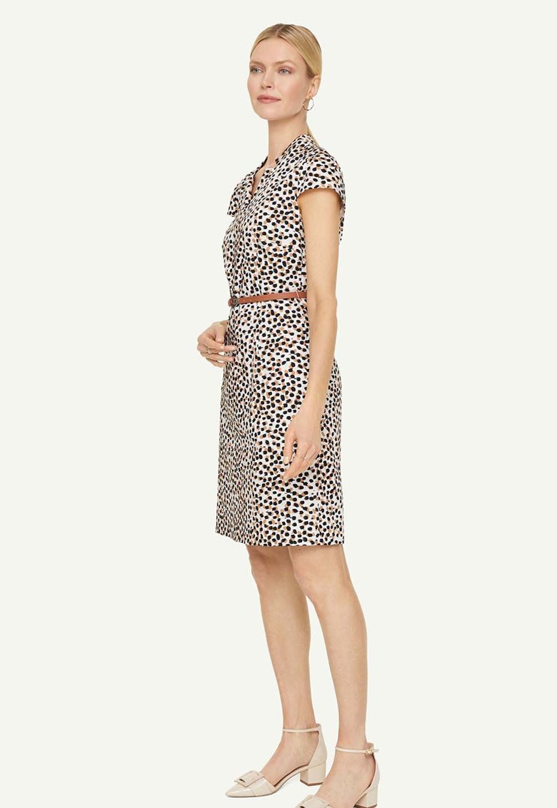 Платье из смесового хлопка – стильный и комфортный вариант для этого теплого сезона. Длина выше колена. Короткий втачной рукав. Вырез горловины – фигурная стойка.