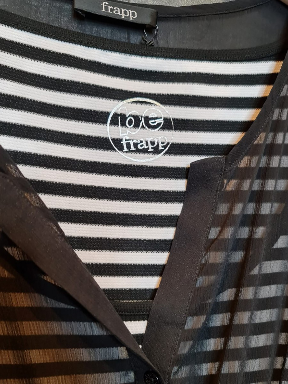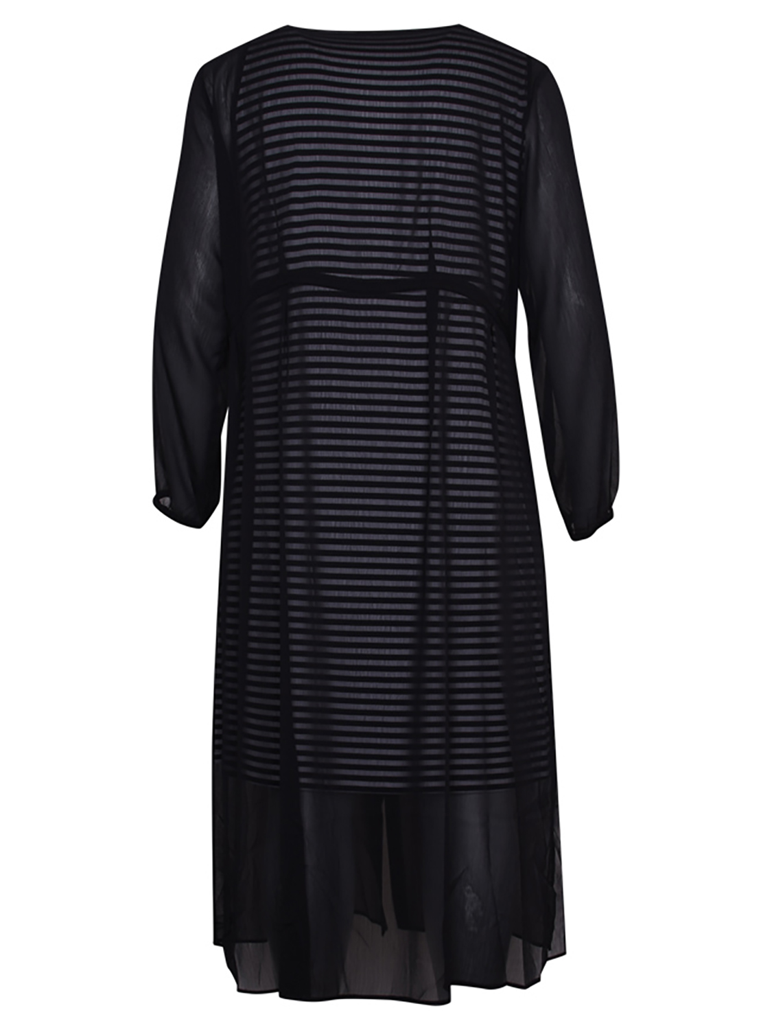 Двуслойное платье длины миди. Нижнее платье в черно-белую полоску, без рукавов, с широкими бретелями и глубоким овальным вырезом горловины. Верхнее платье из полупрозрачного шифона имеет втачной рукав полной длины и кулиску на поясе, застегивается на пуговицы.