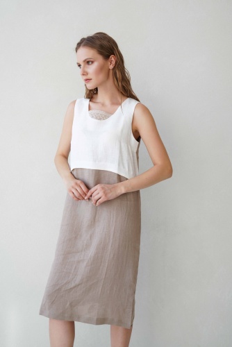 Льяное платье STERN ниже колена отлично подойдет для отдыха на жарких курортах. Модель украшена вязаным элементом на круглом вырезе и накладным фартуком.
