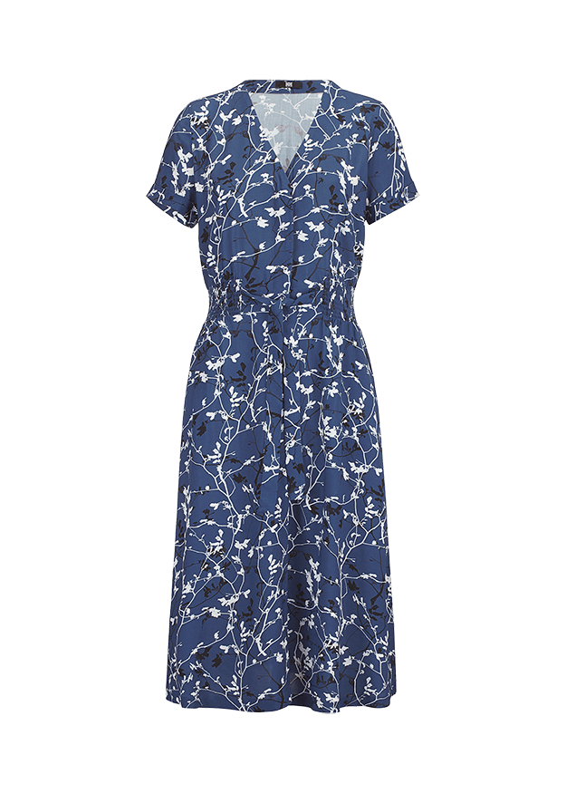 Модное платье миди из струящейся мягкой вискозы. V-образный вырез, короткие рукава и разрез на юбке. На талии присборенная вставка и тканевый пояс.