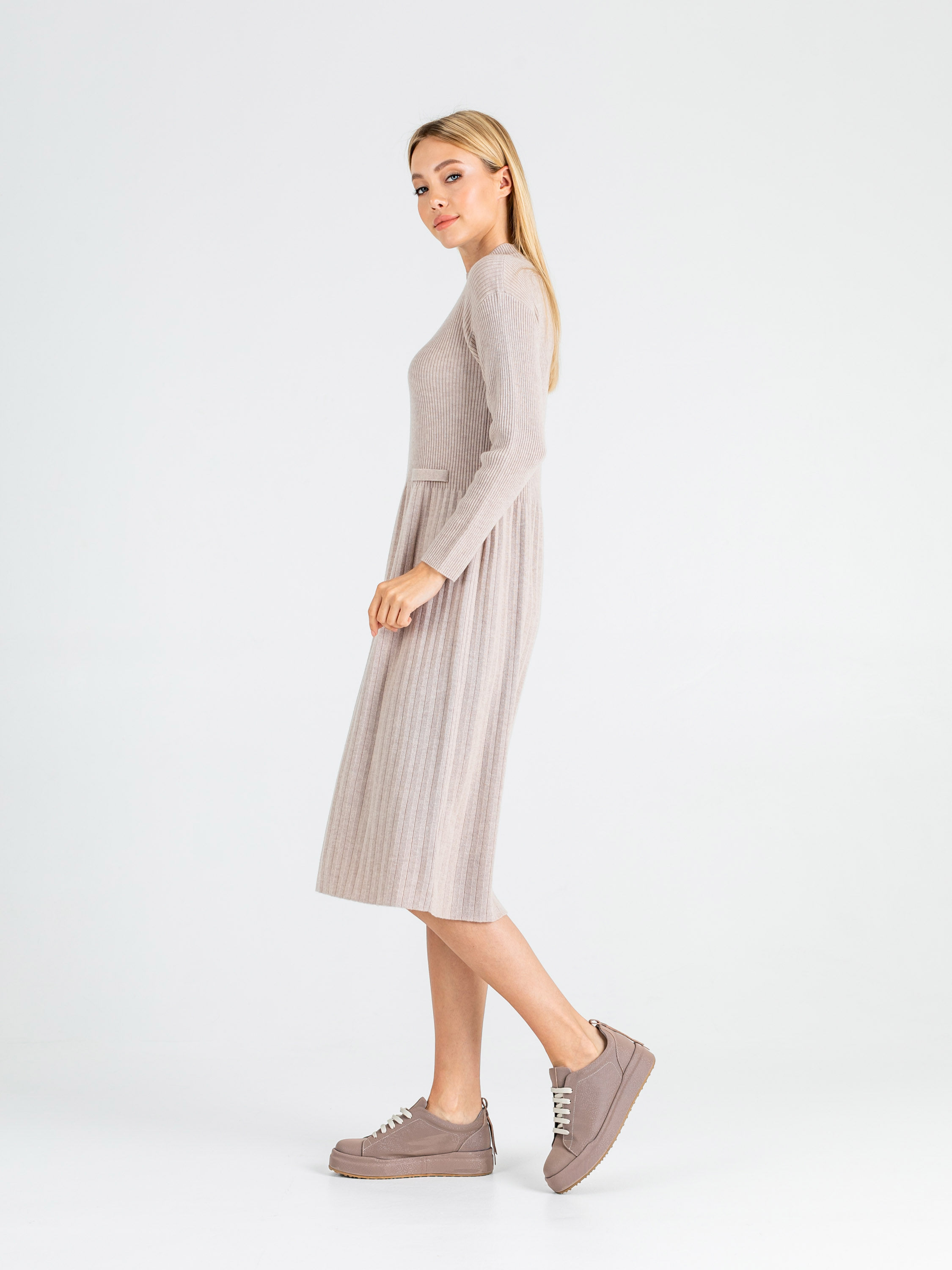 На сайте указаны российские размеры. Крой: женственное приталенное платье с длинным рукавом. Плиссированная, слегка расклешенная книзу юбка, удачно скрывает узкие бедра и добавляет объема, если его недостаёт или, наоборот, маскирует возможные нюансы в области живота и бедер. Стильная базовая модель с круглым, слегка поднятым вырезом, прикрывающим часть шеи. Длина ниже колена – идеальный вариант для создания как рабочего, так и сдержанного торжественного образов. Изготовлено из 100% шерсти, теплое и приятное телу. Отделка: состоит из двух видов фактур: верхняя часть платья – в мелкий рубчик, нижняя – среднее гофре. Чуть выше талии расположена имитация карманов. Сочетайте с высокими сапогами-трубами, ботинками на грубой подошве и спортивной обувью. Рост 177 см