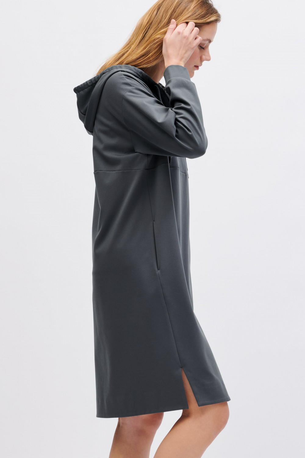 На сайте указаны российские размеры. Платье с капюшоном прямого кроя из смешанной ткани с вискозой. Капюшон на подкладке с кулиской, застежкой на поясную молнию и разрезами по бокам. Модель ростом 178 см