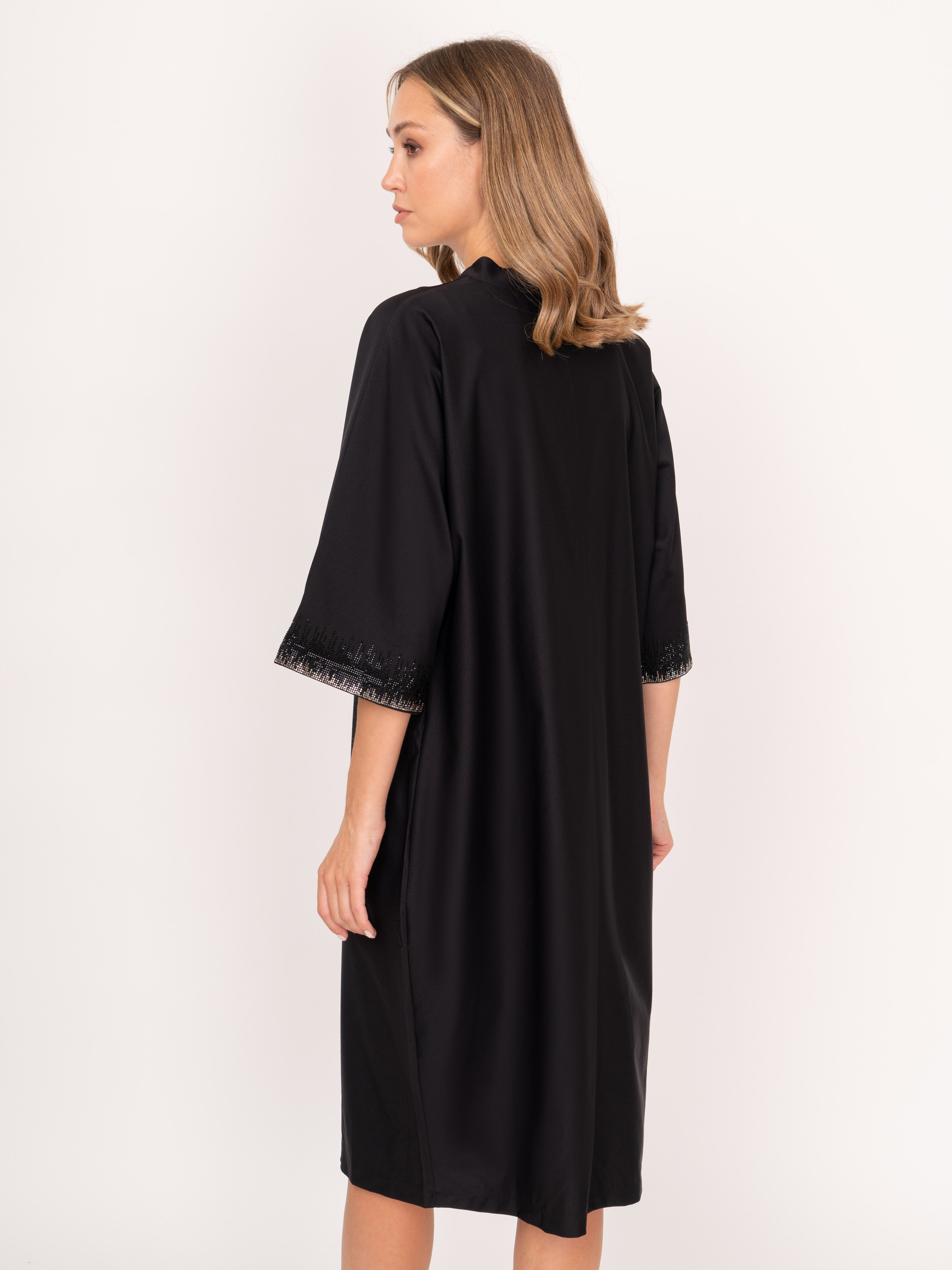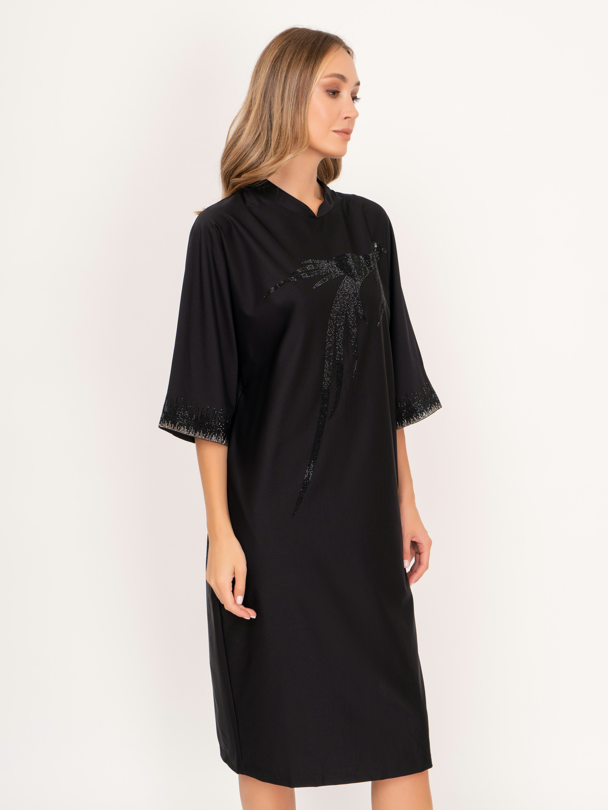 На сайте указаны российские размеры. Прямое черное миди платье с фигурным воротником, с укороченным рукавом 3/4, украшенный стразами. Платье дополняет рисунок птицы из страз. Рост модели: 175 см. Длина платья: 106 см.