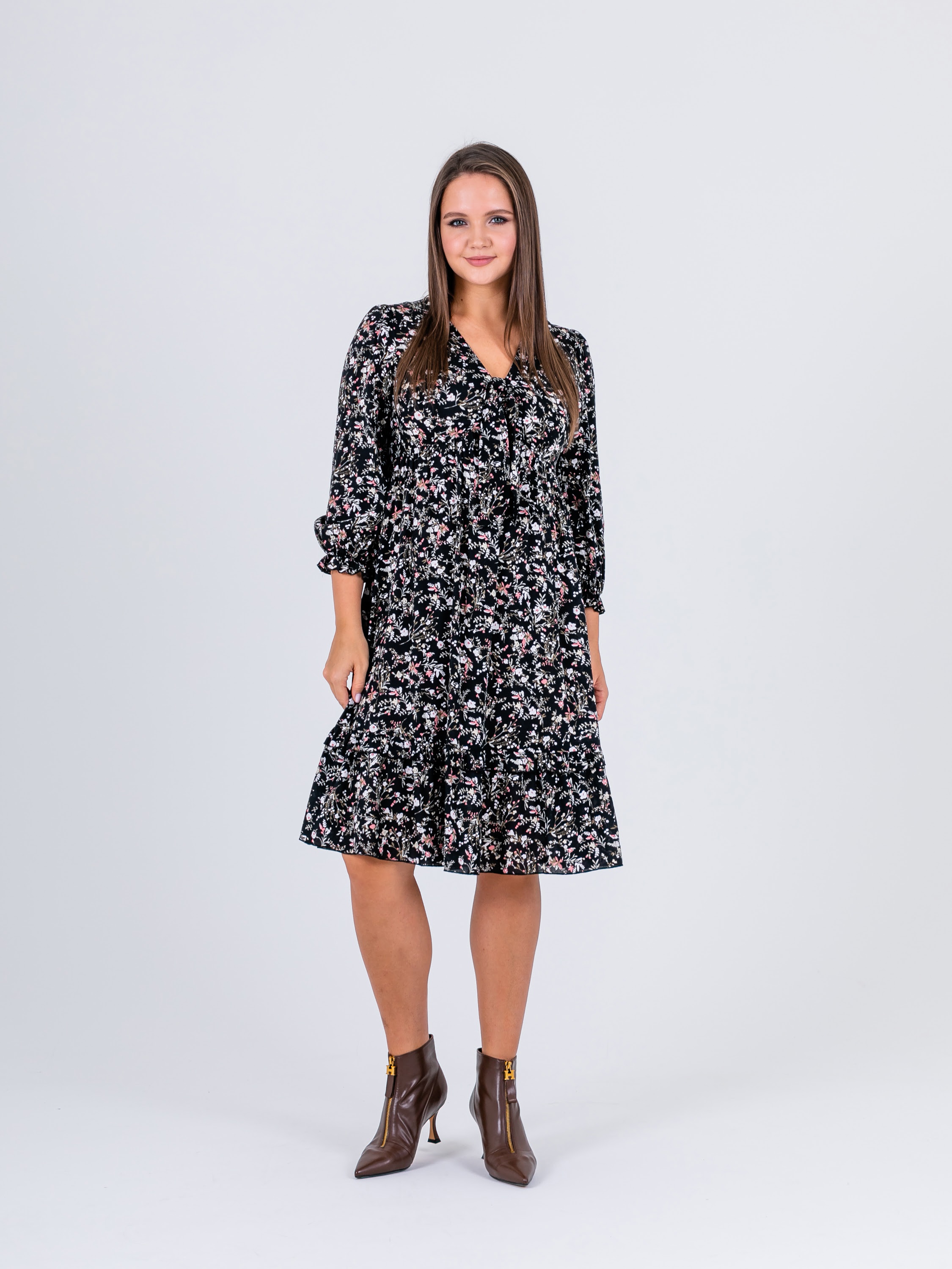 На сайте указаны российские размеры. Крой: платье свободного силуэта из гладкой вискозы в стиле бохо. Отрезное под грудью, расклешенное, имеет втачной рукав, низ которого собран на эластичную тесьму, что позволяет фиксировать его на комфортную высоту и разный объем рук. Платье состоит из двух ярусов, которые выгодное подчеркивают достоинства фигуры и изысканно маскируют недостатки. Платье подойдет женщинам разных фигур и комплекций, а в особенности будущим мамам и прекрасным обладательницам шикарных форм. Отделка: ткань в мелкий цветок создает женственный и романтичный образ, который влюбляет в себя с первого взгляда. Сочетайте с однотонными жакетами и кардиганами из ассортимента Stern.