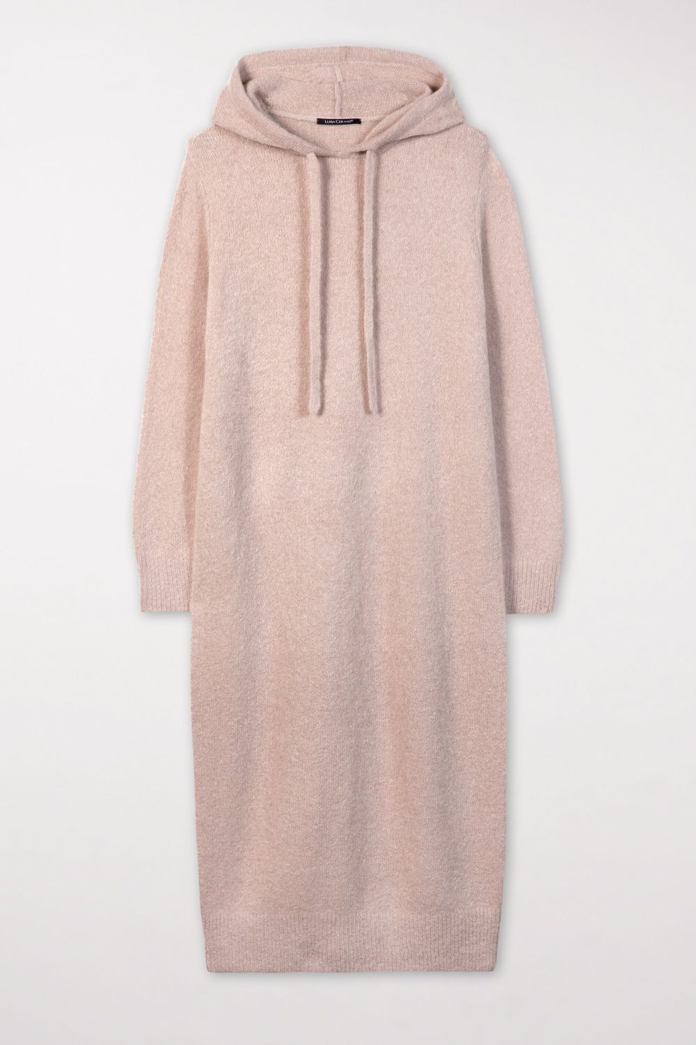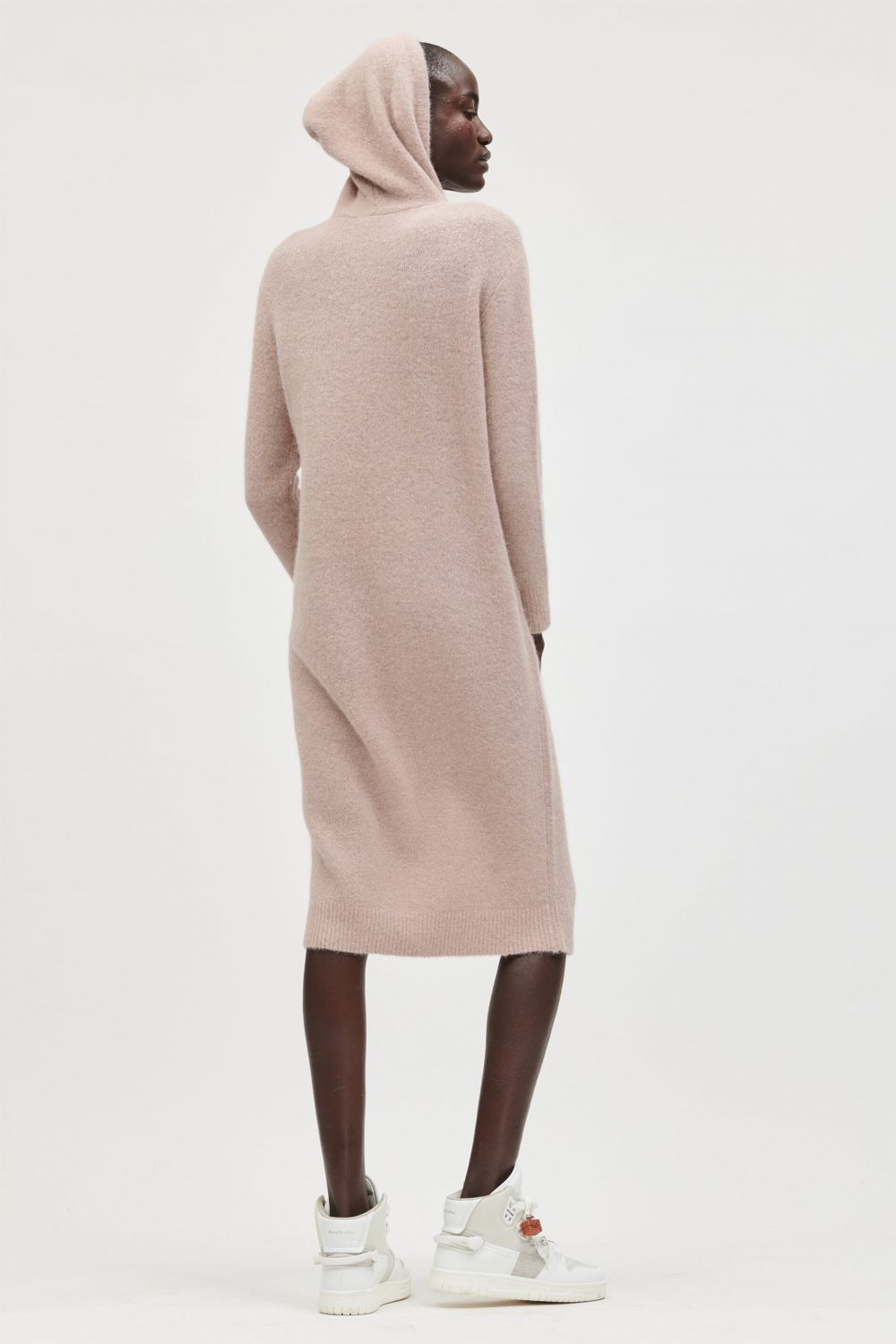 На сайте указаны российские размеры. Длинное платье прямого кроя из высококачественной итальянской смеси альпака с эластичной нитью и мелкими убавляющими деталями и деталями швов. Большой капюшон с кулиской сохраняет тепло и тепло. Рост модели 178 см.
