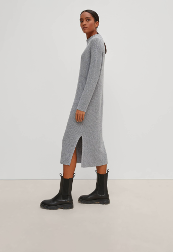 На сайте указаны российские размеры. Трикотажное платье из смесовой шерсти с кашемиром длины миди. Длинные рукава. Подол с разрезами по бокам. Длина для размера 42 около 113 см. Рост модели 177 см.
