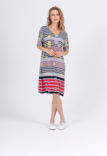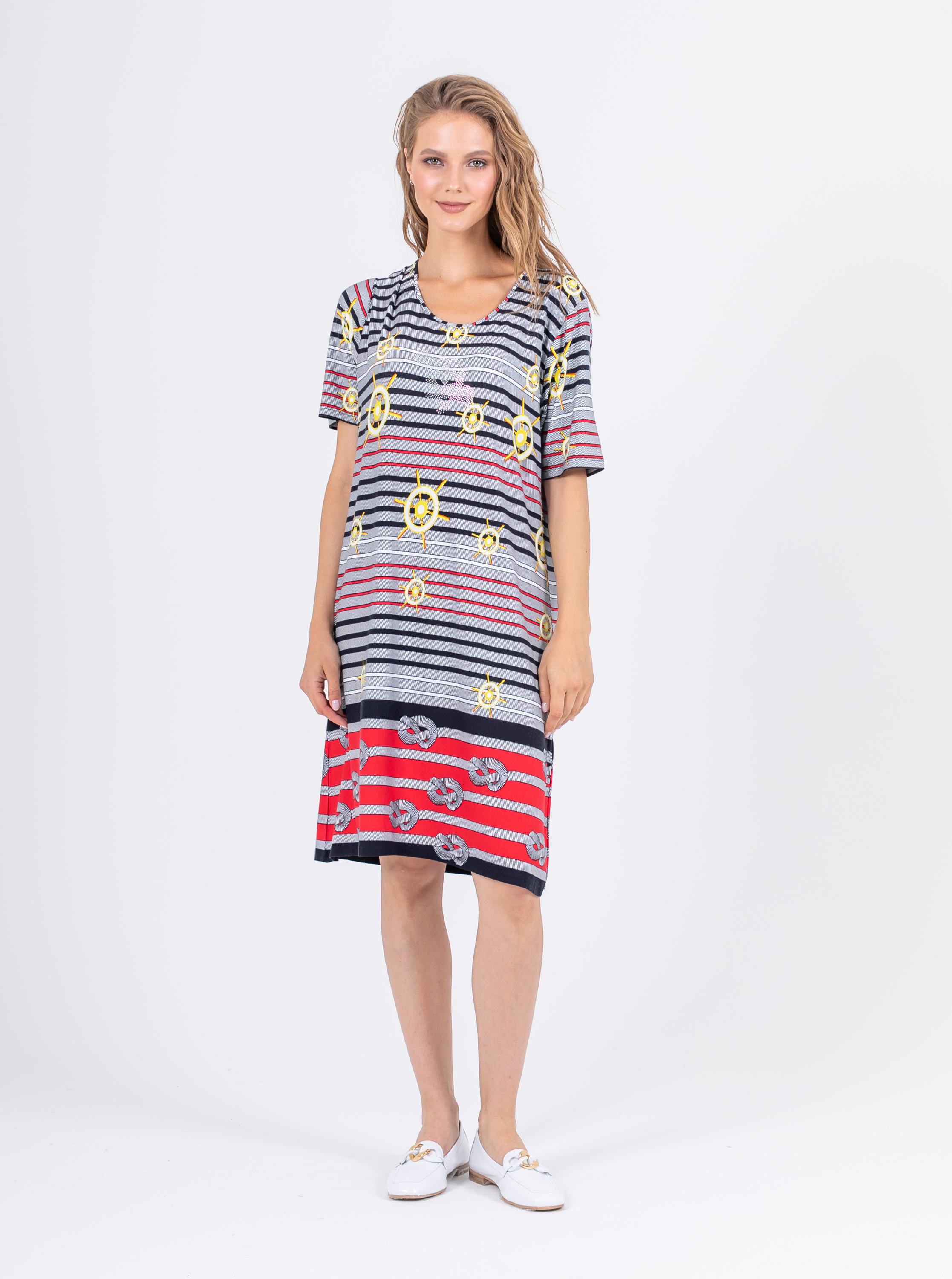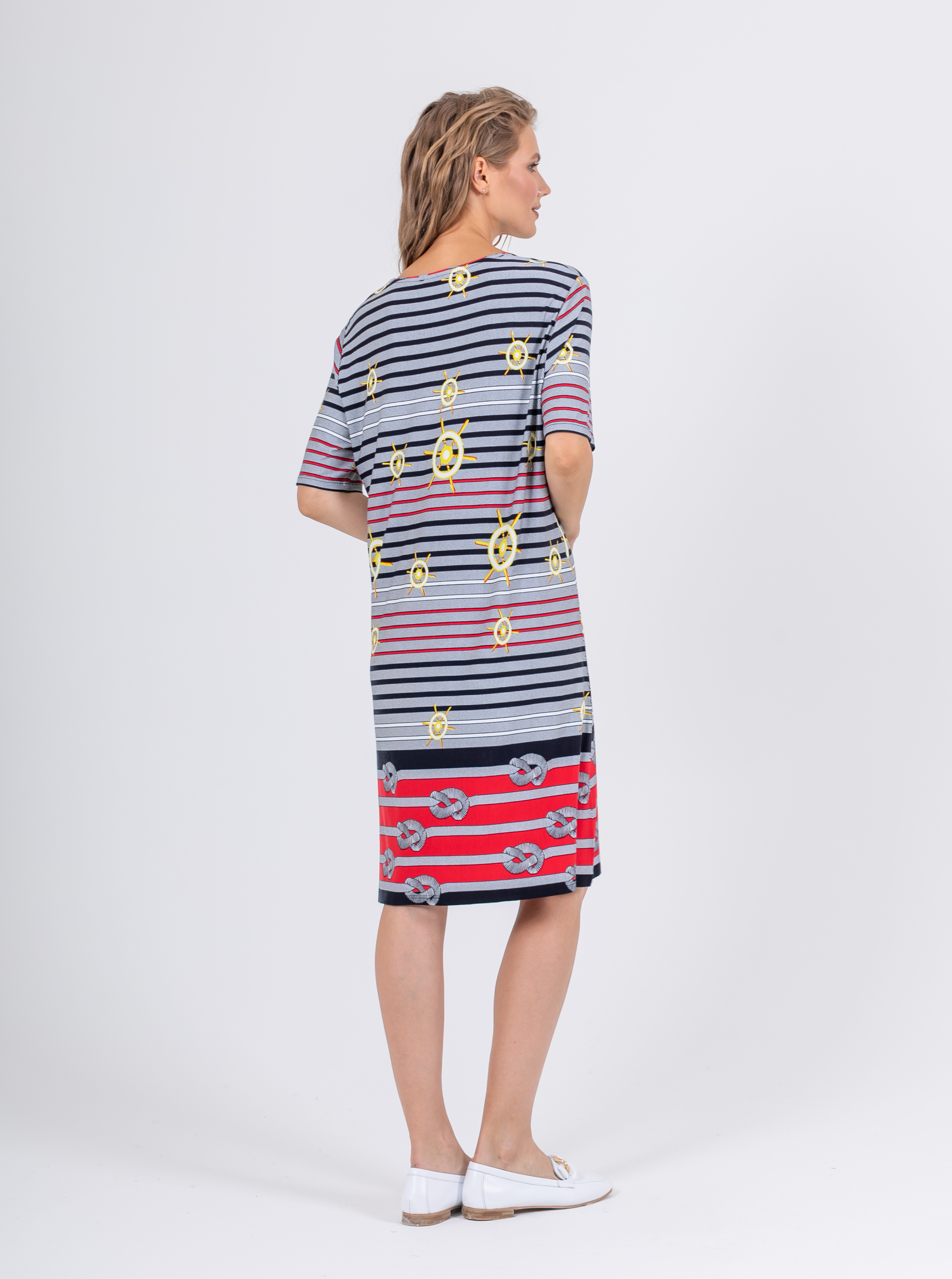На сайте указаны российские размеры. Крой: платье прямого силуэта с коротким втачным рукавом и круглым вырезом – универсальная модель, подходящая под разные типы фигуры. Длина чуть ниже колена позволяет создать гармоничный женственный образ, в котором вы будете чувствовать себя достойно. Платье выполнено из приятной вискозы средней плотности – она прекрасно держит форму, но при этом не подчеркивает возможные нюансы фигуры. Отделка: полоски, штурвалы и канаты – ваше море всегда будет с вами. А чтобы усилить эффект, в зоне груди расположена аппликация из блестящих страз, повторяющих очертания морского узла из принта. Сочетайте платье с жакетами и мягким трикотажем из коллекции Stern.