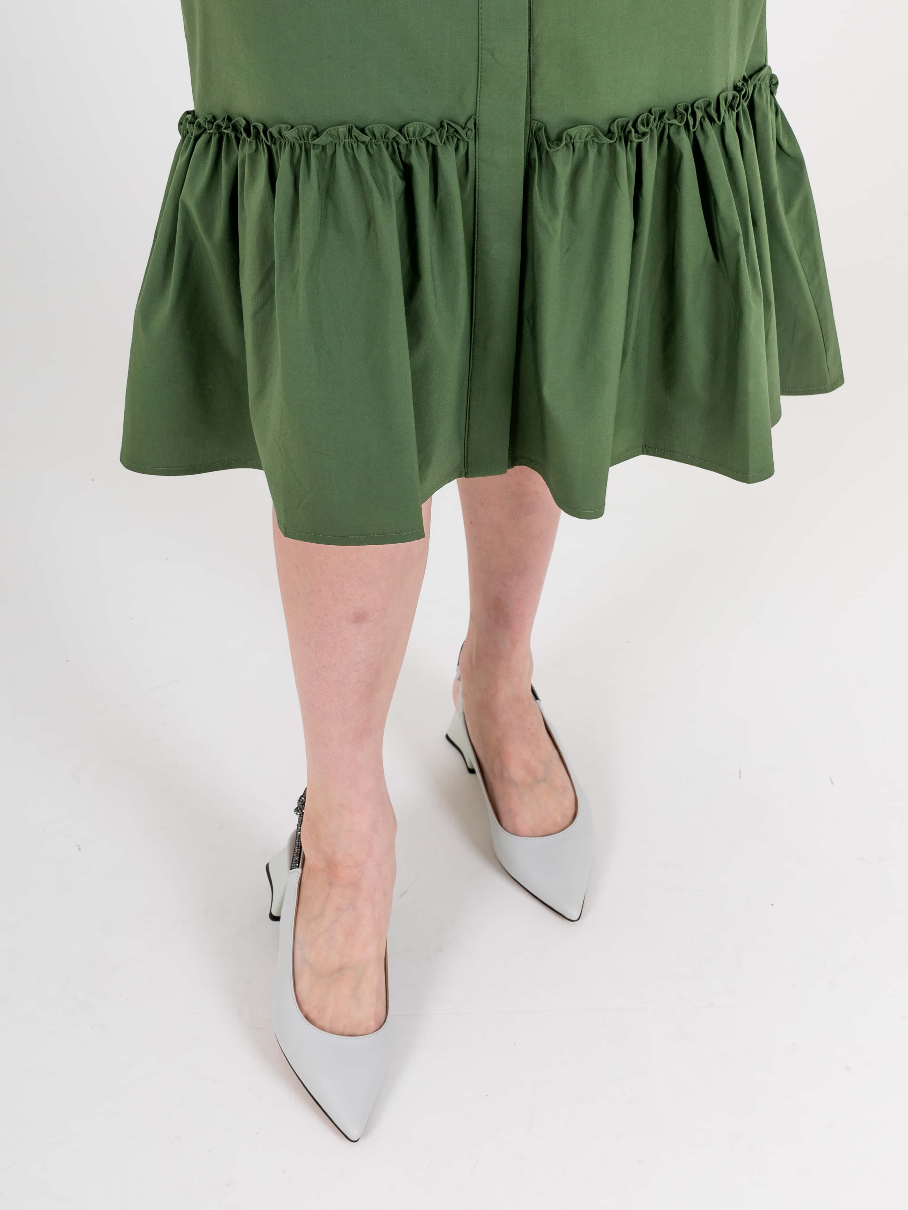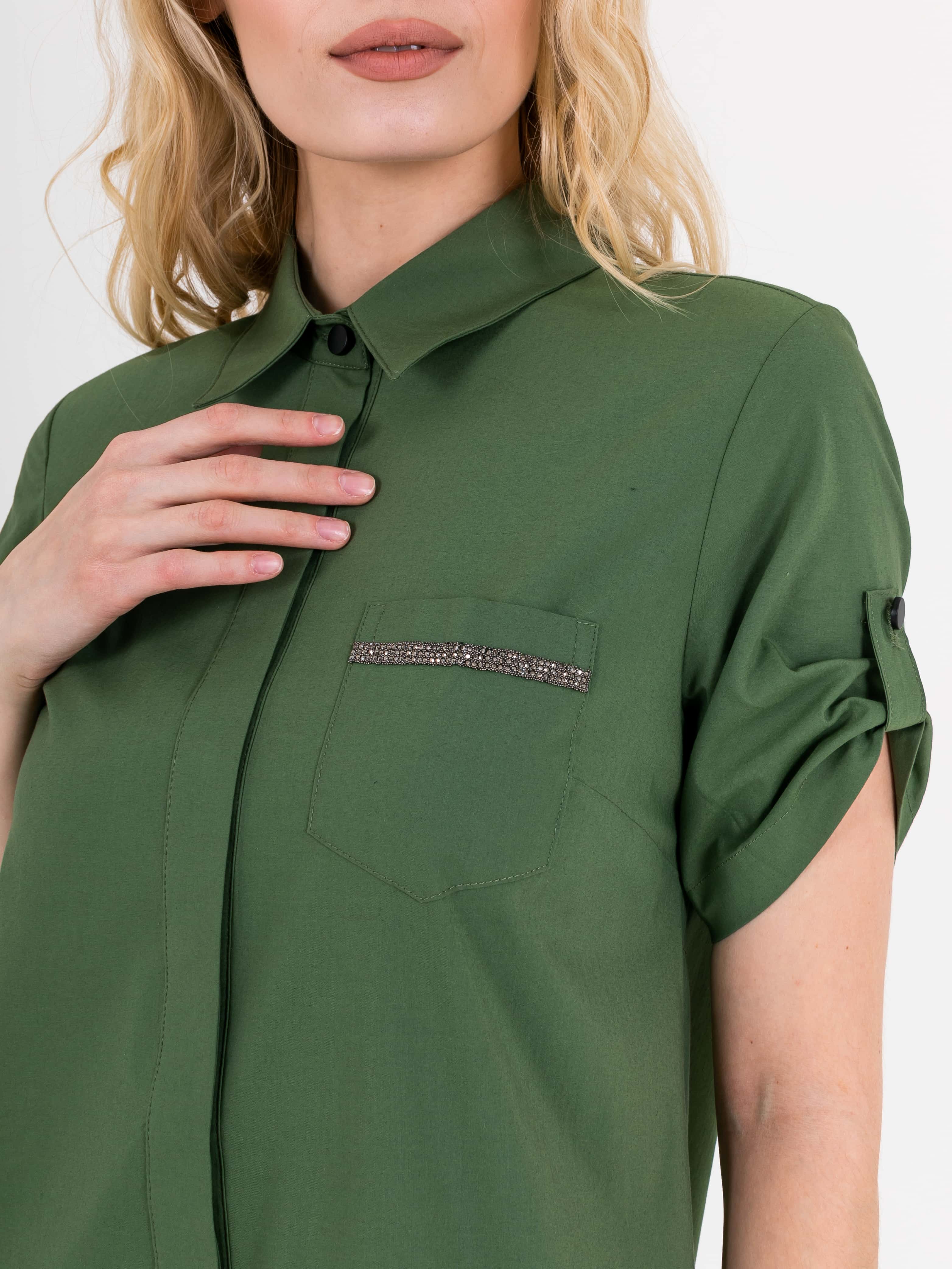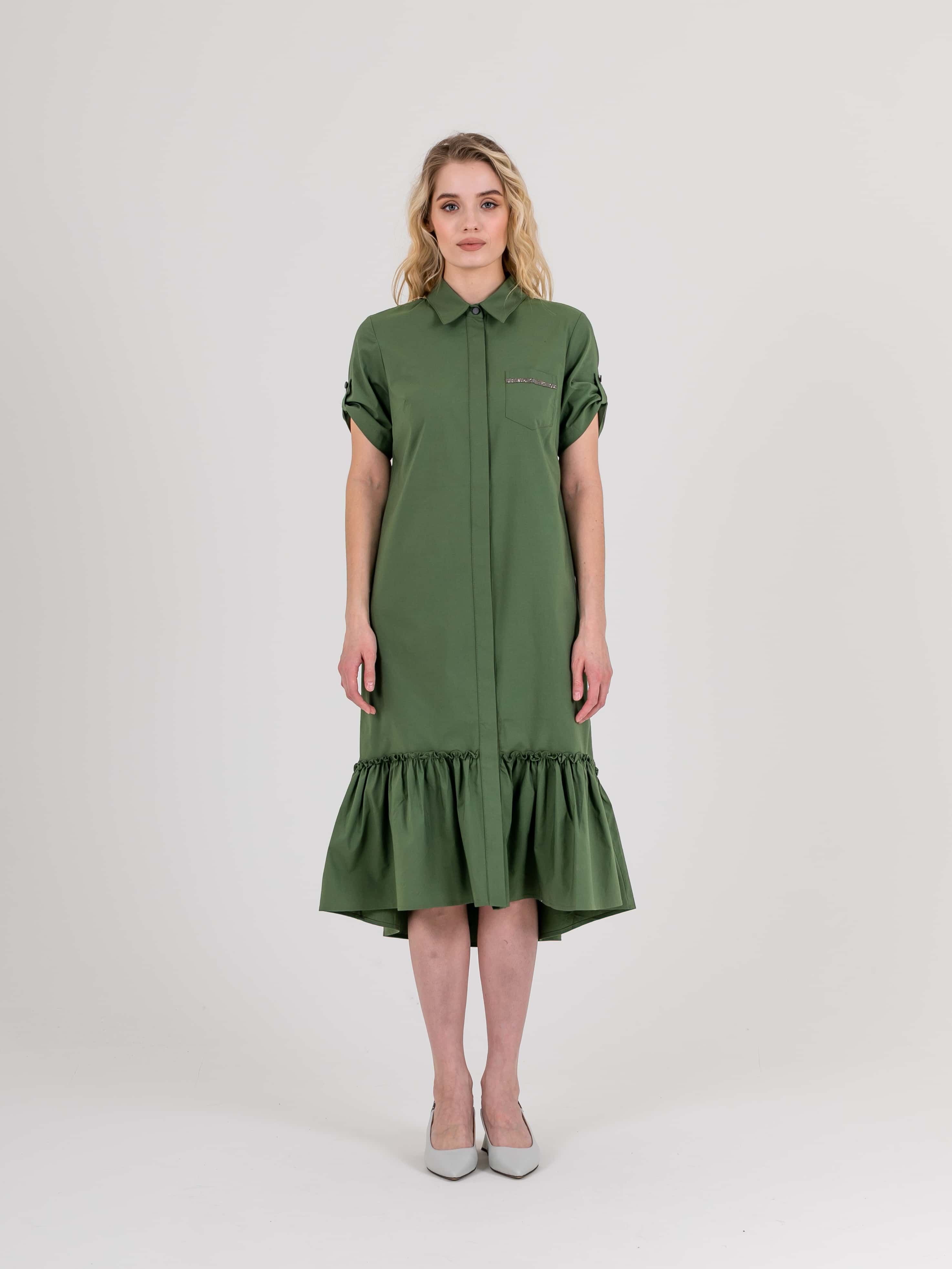 На сайте указаны российские размеры. Платье-рубашка А-силуэта длина миди с ассиметричной линией низа и оборкой. Перед с двумя вытачками на выпуклость груди, идущими из боковых швов и прорезными карманами. Застежка потайная на 10 пуговиц. Также в области груди располагается накладной карман с декоративной аппликацией из страз. Укороченные рукава с патами на пуговицах. Стояче-отложной воротник.