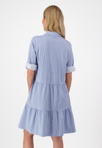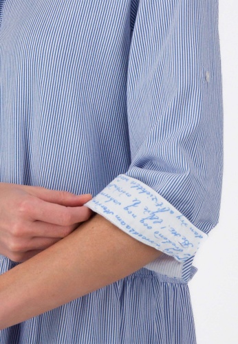 На сайте указаны российские размеры. Повседневное платье носит романтический характер благодаря двухъярусным оборкам, которые разбавляются сочетанием горизонтальных и вертикальных полосок и воротнику-стойке с планкой на потайных пуговицах. На воротнике и закатанных рукавах длиной 3/4 спрятан стильный буквенный принт — здесь внимание к деталям становится еще заметнее. Благодаря боковым карманам и прочному трикотажному материалу платье justWhite может стать вашим любимым летним платьем! Рост модели: 177 см.