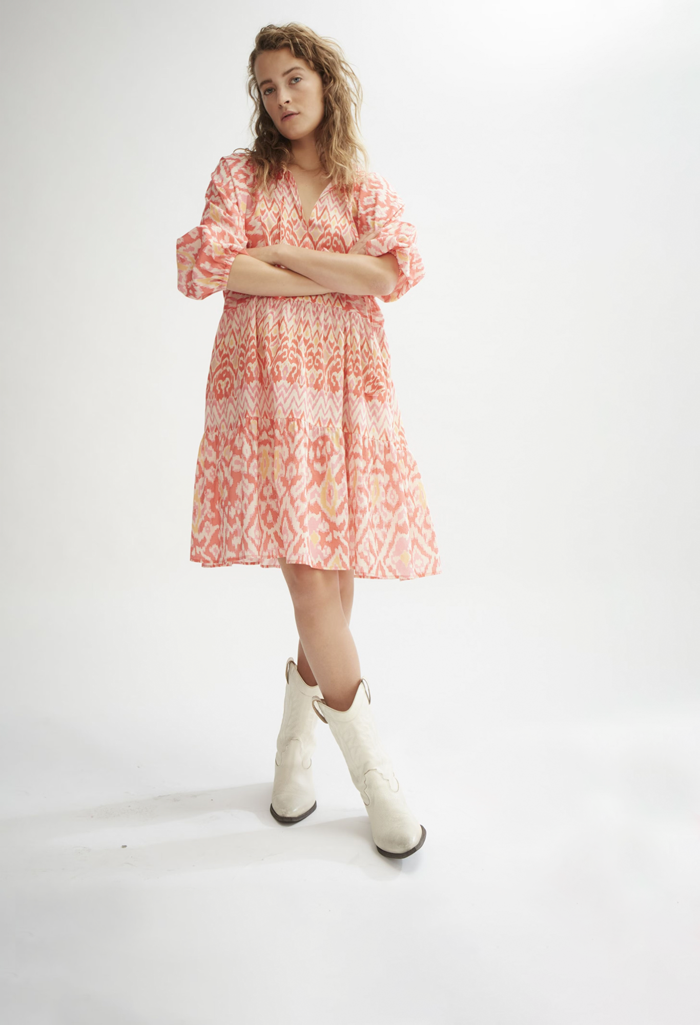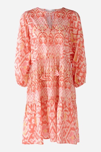 На сайте указаны российские размеры. Красочной платье миди с хлопковой вуалью и сплошным принтом ярких цветов. Платье А-силуэта с особым объемом рукава и расклешенной юбкой. Комбинация в тон с тонкими ремешками из хлопкового вуали. Боковые карманы на хлопковой подкладке в тон. Лента для переплета с отделкой в виде цветка из внешней ткани. Эластичные манжеты обеспечивают дополнительный комфорт. Длина в размере 42: 98 см.