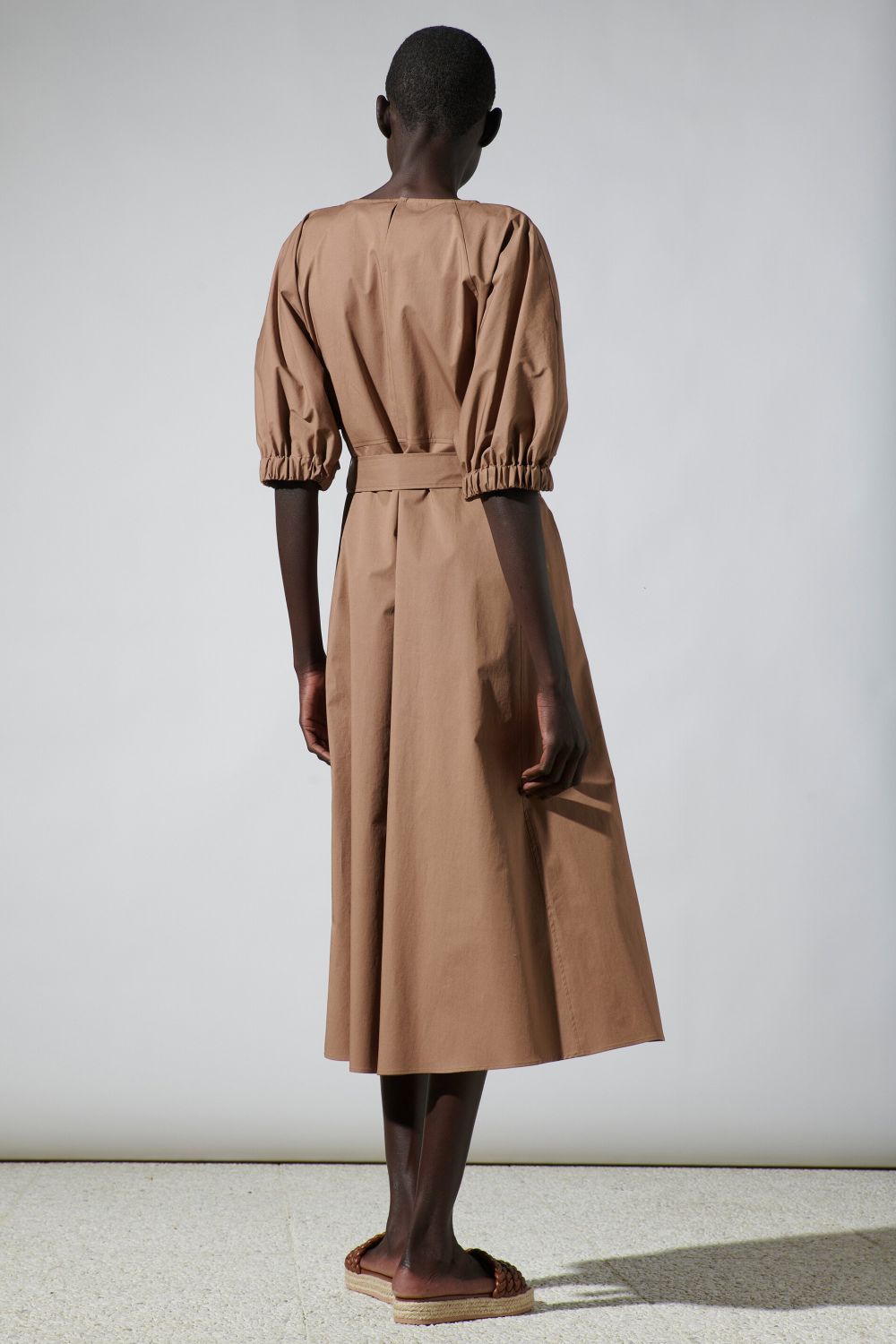 На сайте указаны российские размеры. Платье средней длины из тонкой тканой габардиновой эластичной ткани со сдержанной посадкой и расклешенным силуэтом, круглым вырезом горловины с застежкой на пуговицы и короткими рукавами с эластичной застежкой. Женственность на талии подчеркивается завязывающимся поясом. Рост модели 178 см.