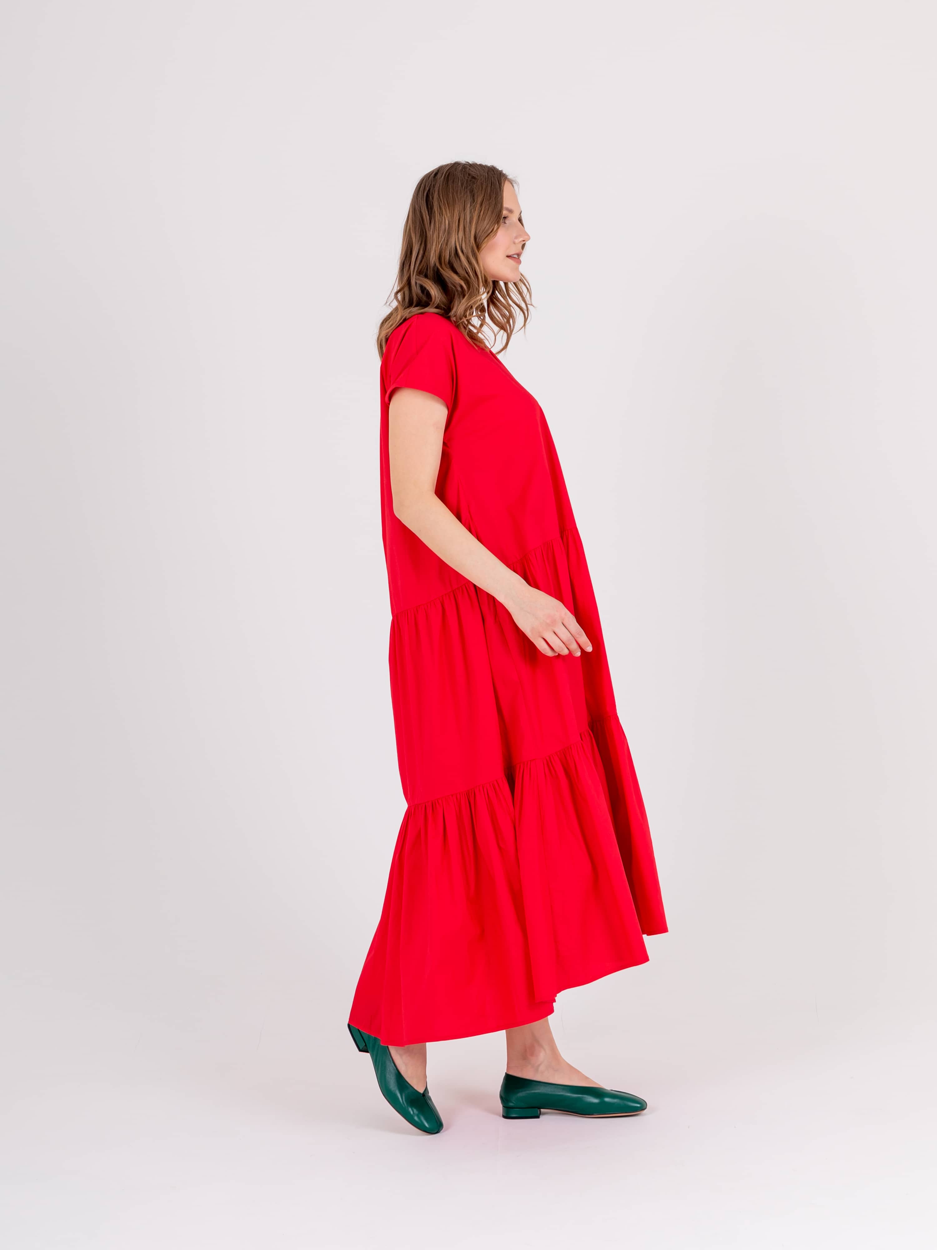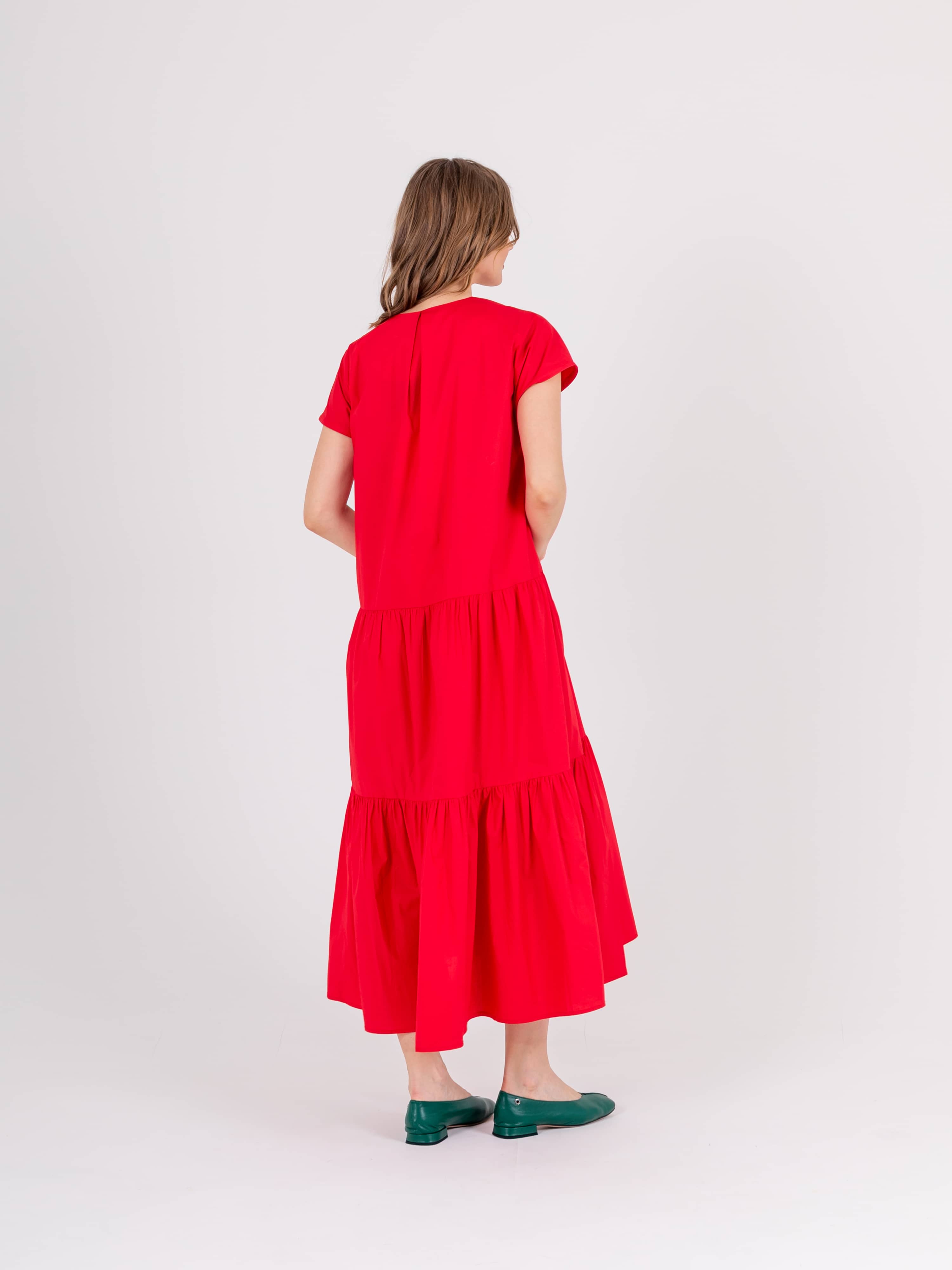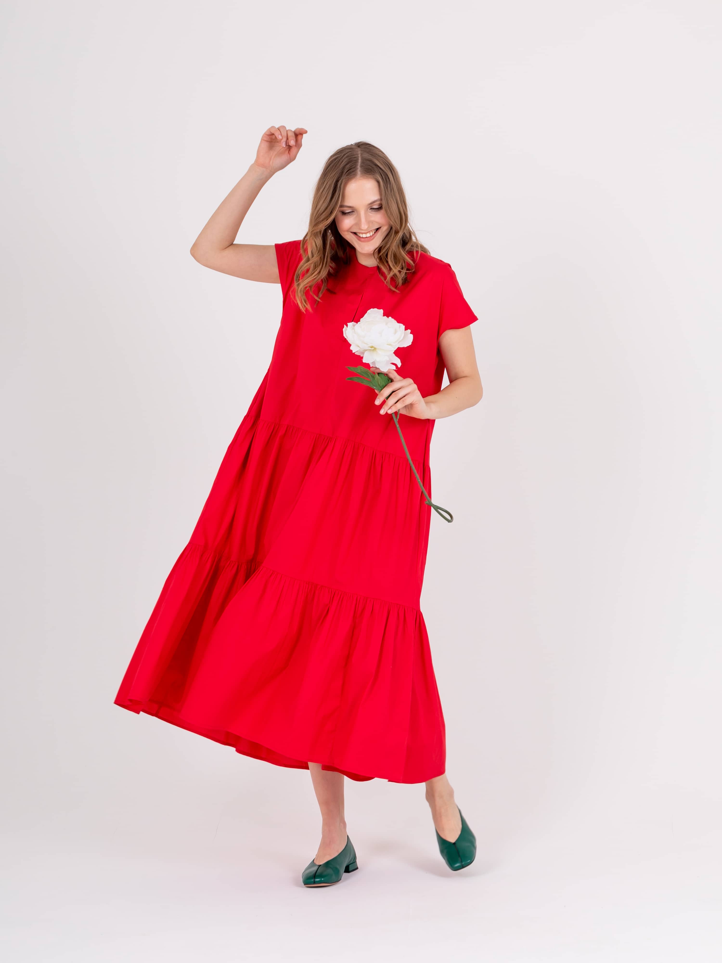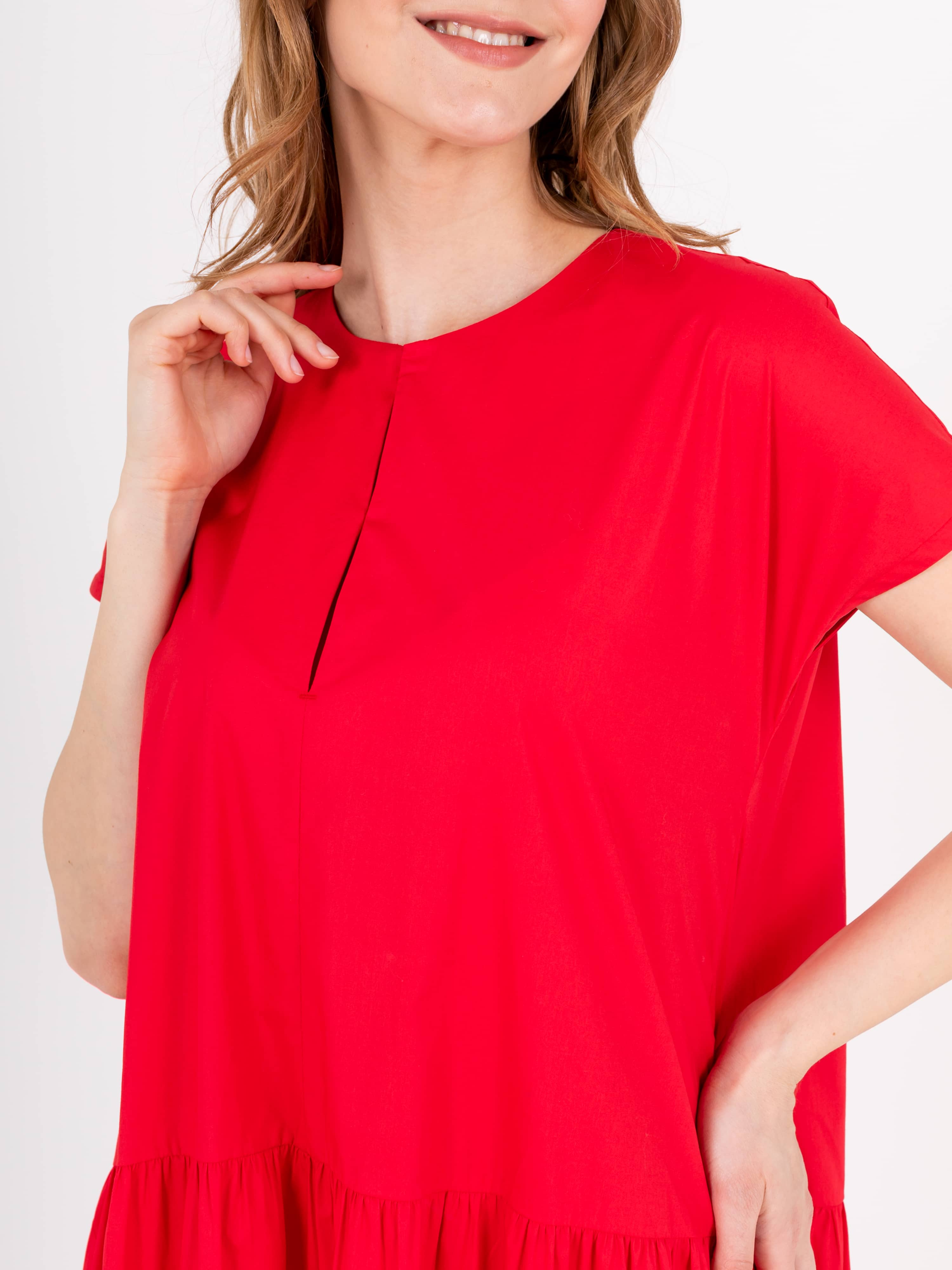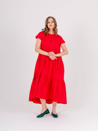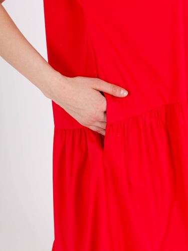 Платье А-силуэта длиной midi из легкого 100% хлопка с оборкой чуть ниже талии и по низу, в боковых швах располагаются два кармана. Укороченные цельнокроеные рукава. Круглый вырез горловины с разрезом по переду и встречной складкой по спинке.