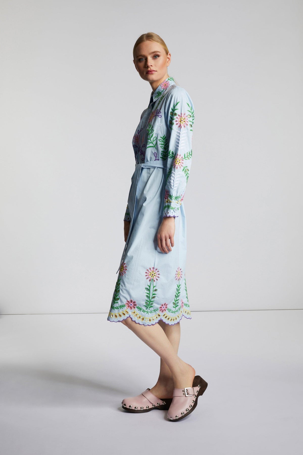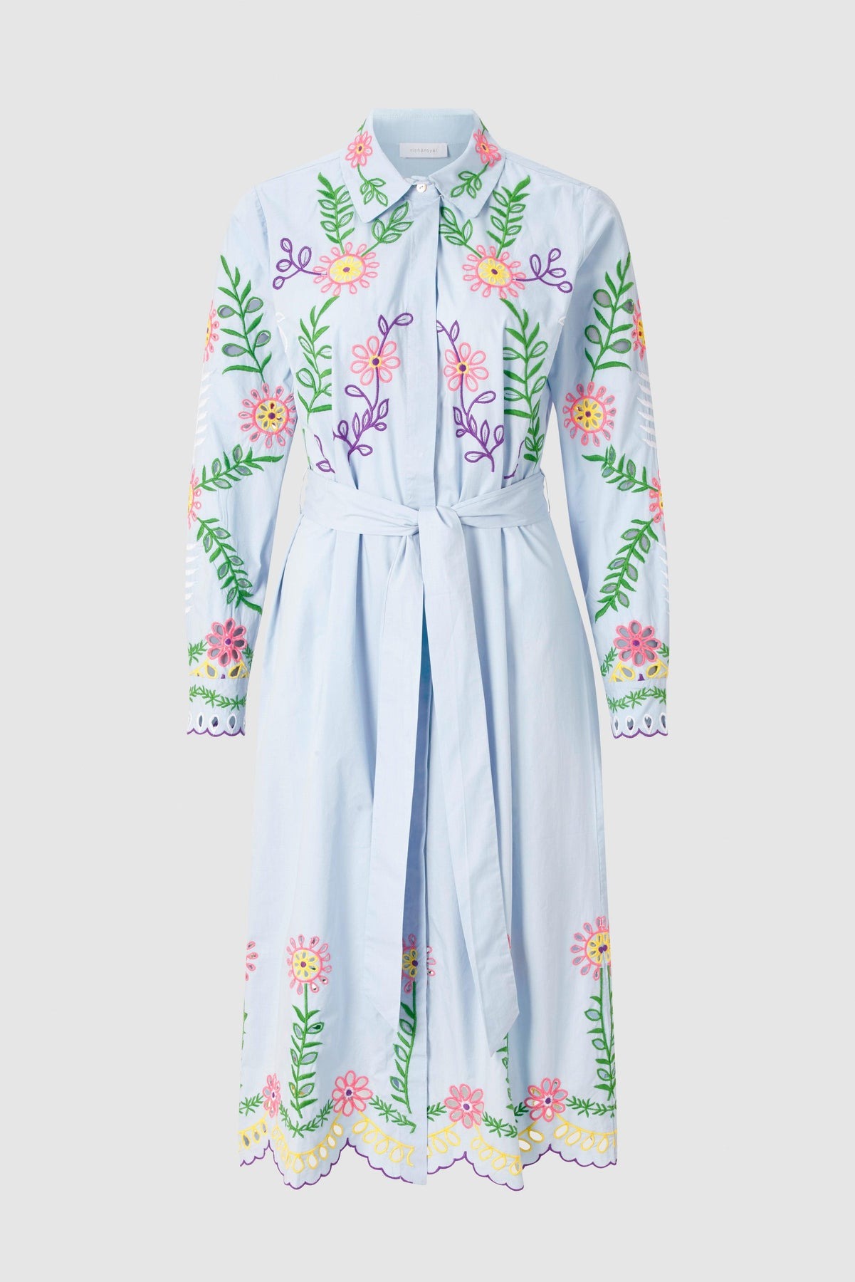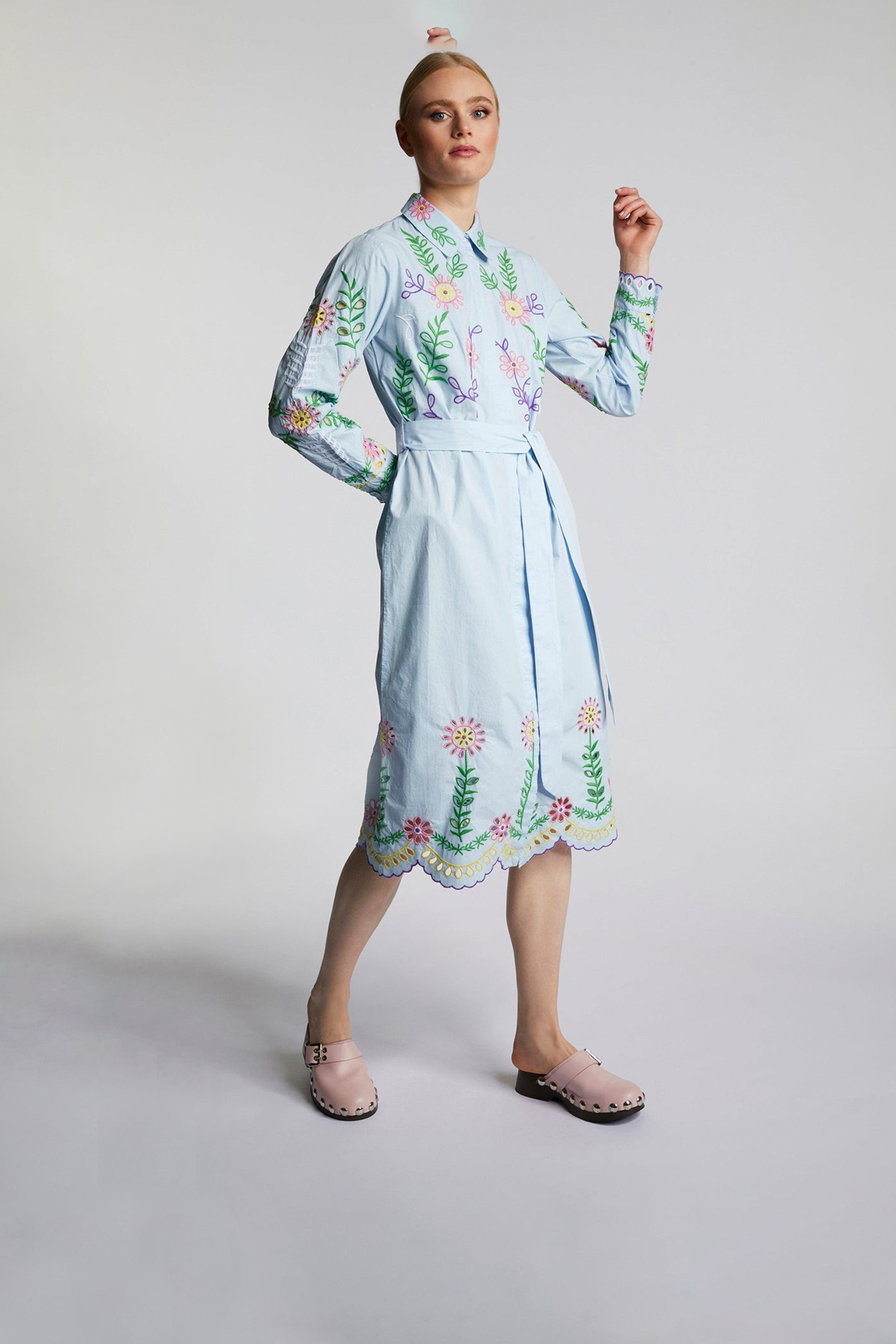 Привлекательность этого устойчивого платья-рубашки — разноцветная вышивка с деталями. Оно имеет непрерывную планку на потайных пуговицах и длинные рукава с манжетами. Пояс на завязках придает А-силуэту платья миди форму талии. Длина в размере 42: 116 см.