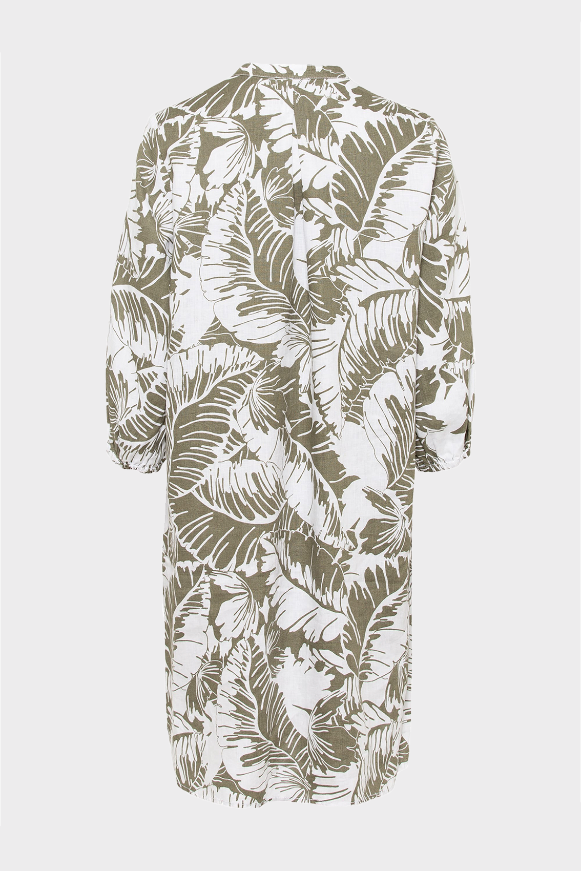 Платье с тропическим садовым принтом. Застежка на пуговицах позволяет носить его закрытым как платье или расстегнутым как удлиненный плащ или пляжную накидку. Закругленная кромка и потайные боковые карманы изготовлены из 100 % льна, обеспечивающего воздухопроницаемость и комфорт.