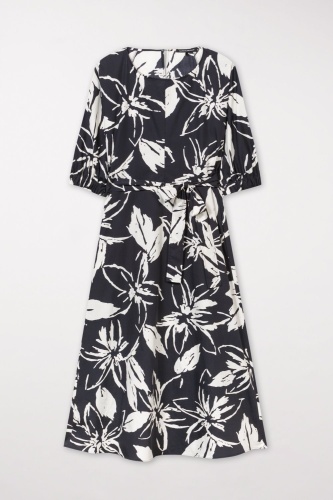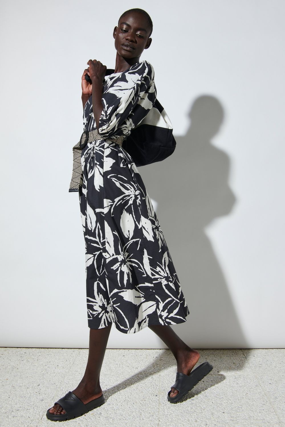 Платье средней длины из хлопкового поплина с эксклюзивным рисунком в виде цветов гибискуса и двумя карманами. Слегка расклешенный фасон юбки подчеркивается завязывающимся на талии поясом. Рукава-крылышки имеют более широкий дизайн и отделаны эластичной окантовкой.