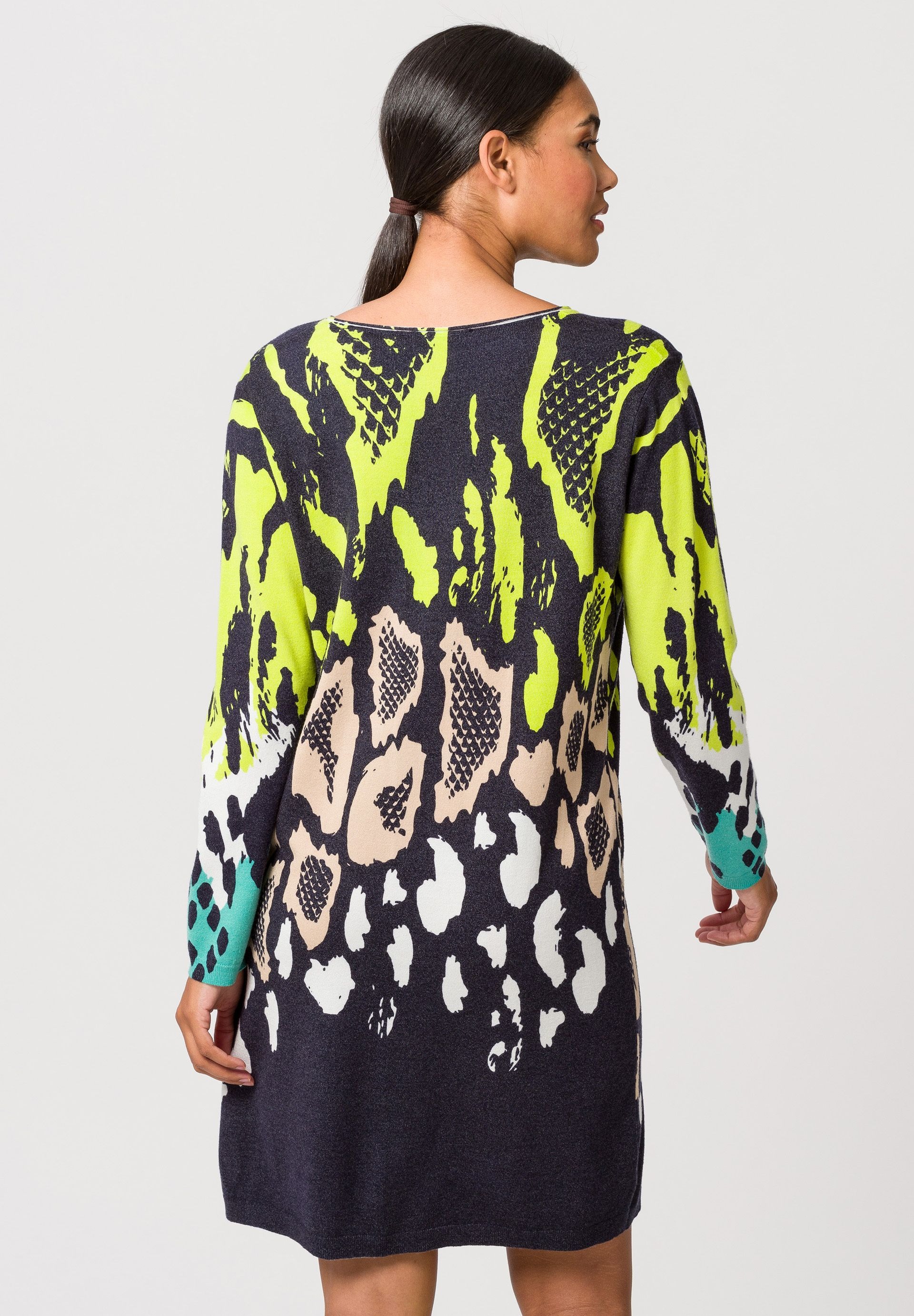 Трикотажное платье для женщин с широким V-образным вырезом и закатанным подолом. Мягкий и уютный тонкий трикотаж украшен таким выразительным и сочетающимся по цвету животным принтом. Кроме того, широкий V-образный вырез подчеркивает женственное декольте.